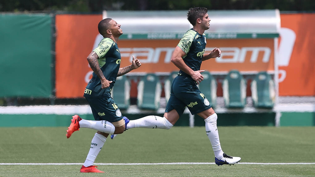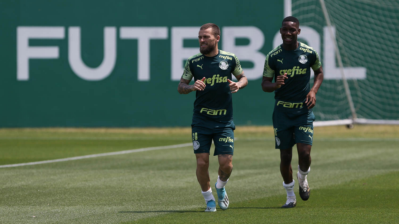 Os jogadores Lucas Esteves e Benjamín Kuscevic (D), da SE Palmeiras, durante treinamento, na Academia de Futebol. (Foto: Cesar Greco)