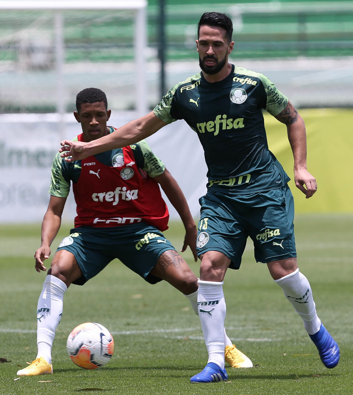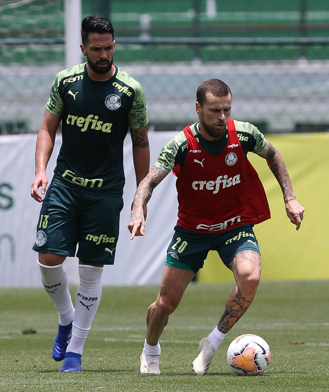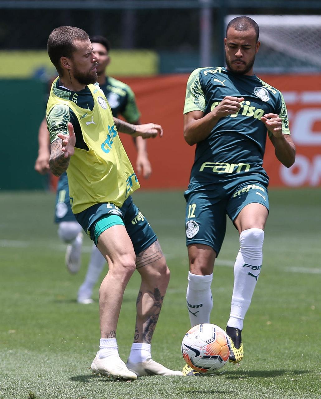 Os jogadores Lucas Lima e Mayke (D), da SE Palmeiras, durante treinamento, na Academia de Futebol. (Foto: Cesar Greco)