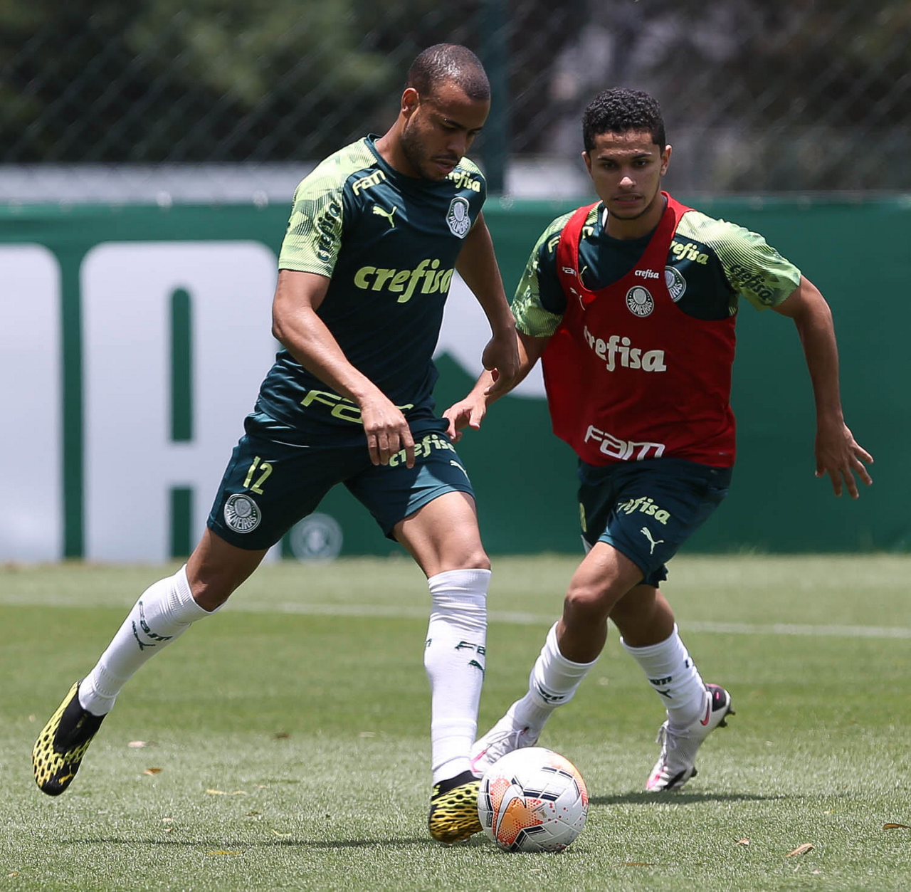 Os jogadores Mayke e Gabriel Silva (D), da SE Palmeiras, durante treinamento, na Academia de Futebol. (Foto: Cesar Greco)