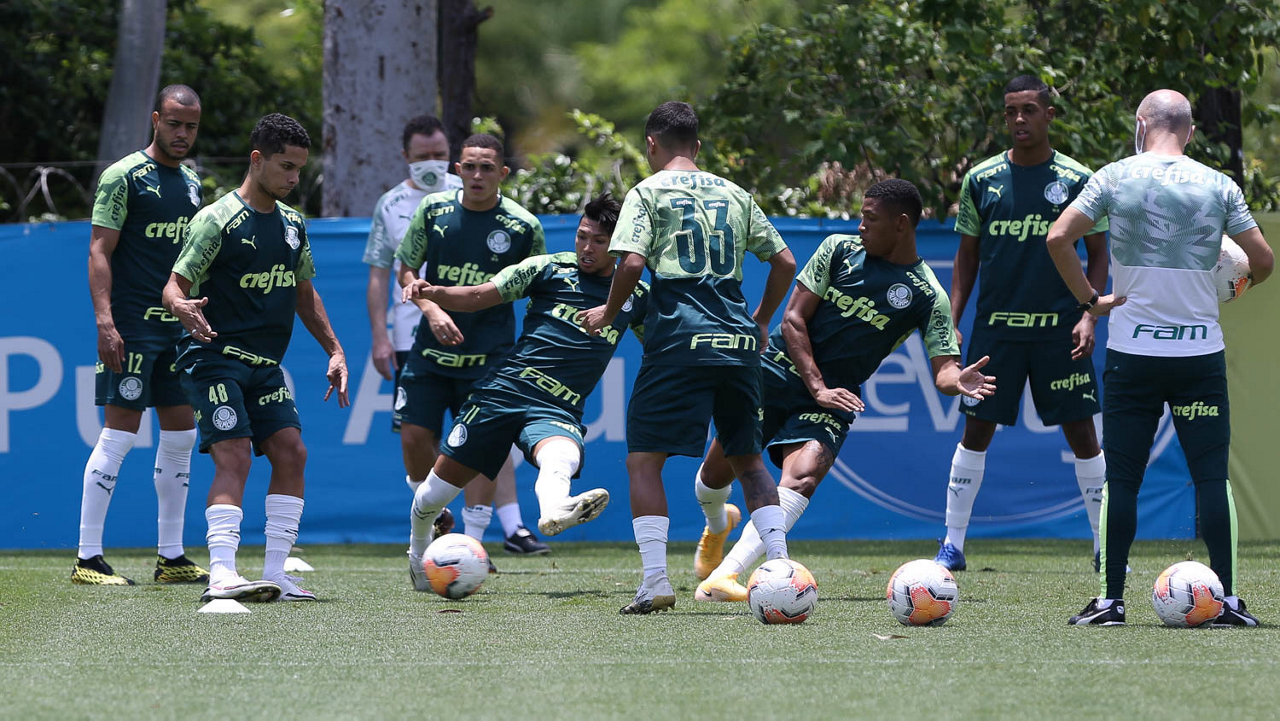 Os jogadores da SE Palmeiras, durante treinamento, na Academia de Futebol. (Foto: Cesar Greco)