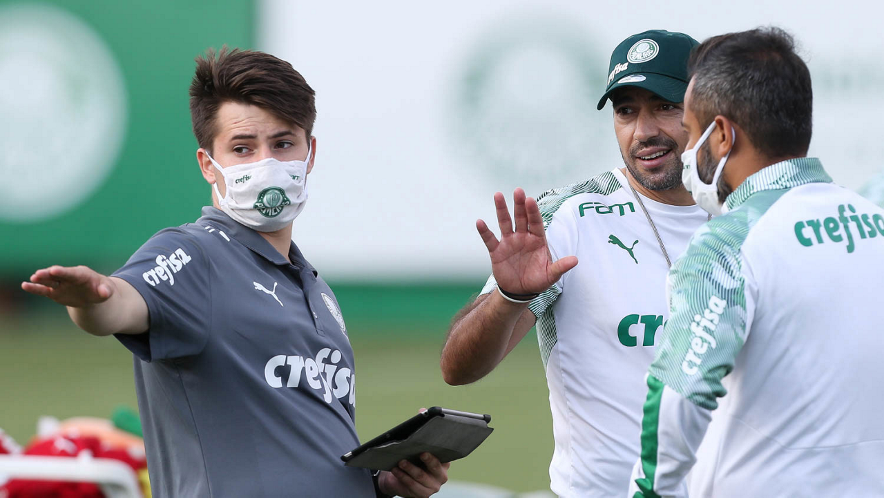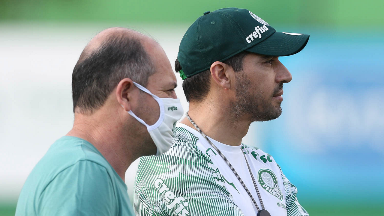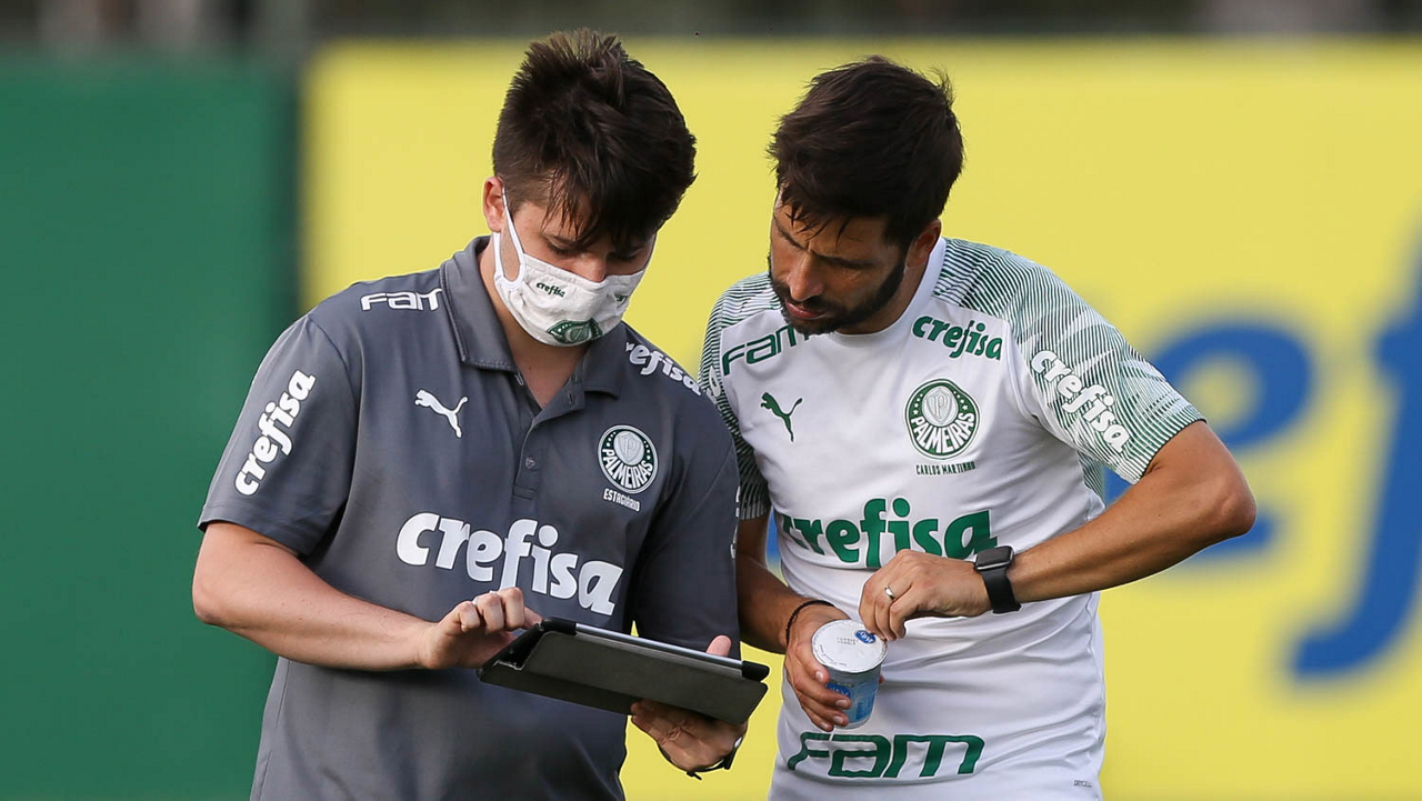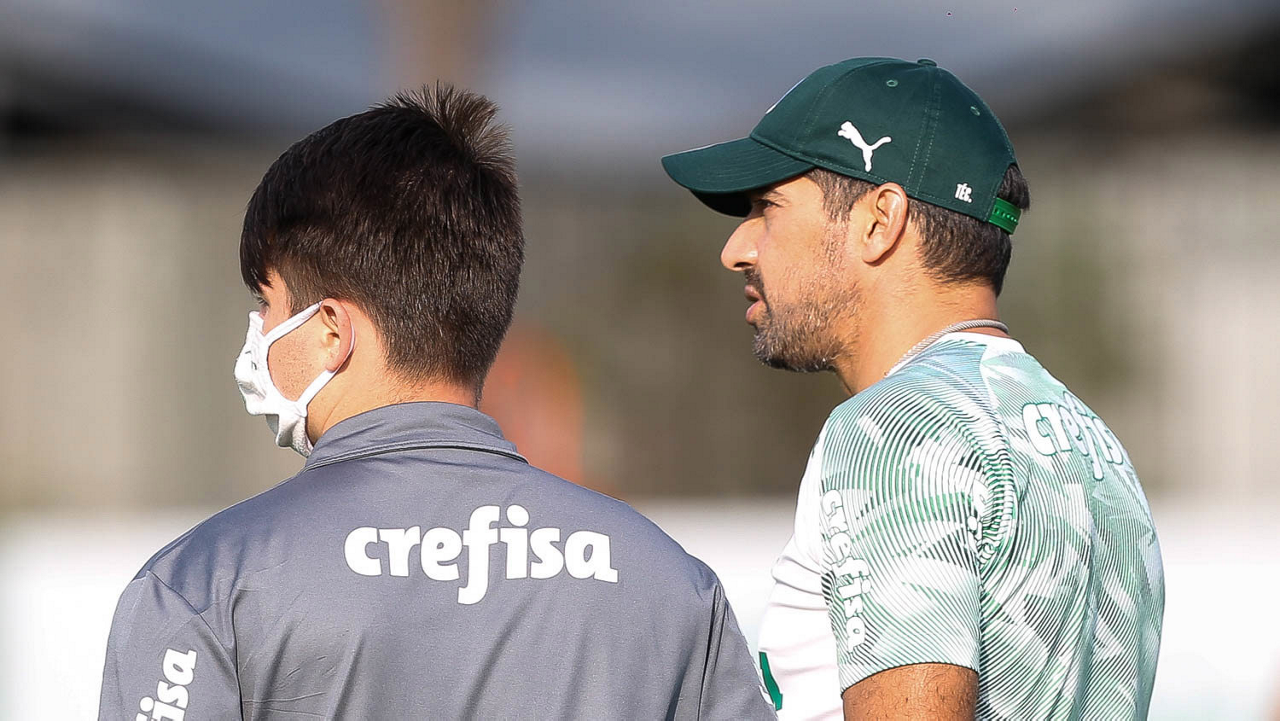 O técnico Abel Ferreira e o estagiário Joãozinho (E), da SE Palmeiras, durante treinamento, na Academia de Futebol. (Foto: Cesar Greco)