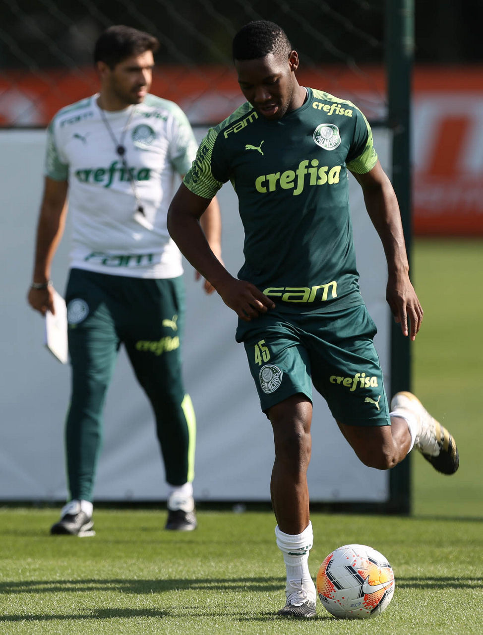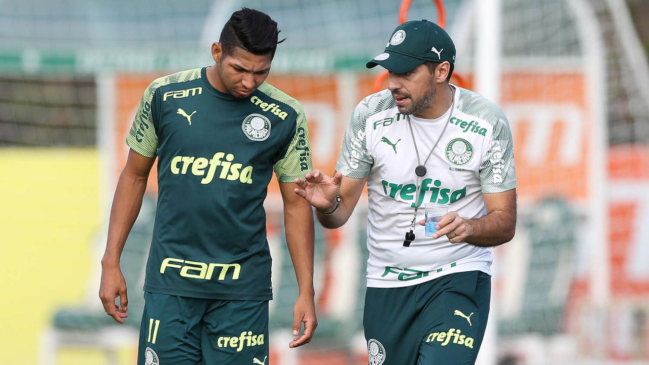 O técnico Abel Ferreira e o jogador Rony (E), da SE Palmeiras, durante treinamento, na Academia de Futebol. (Foto: Cesar Greco)