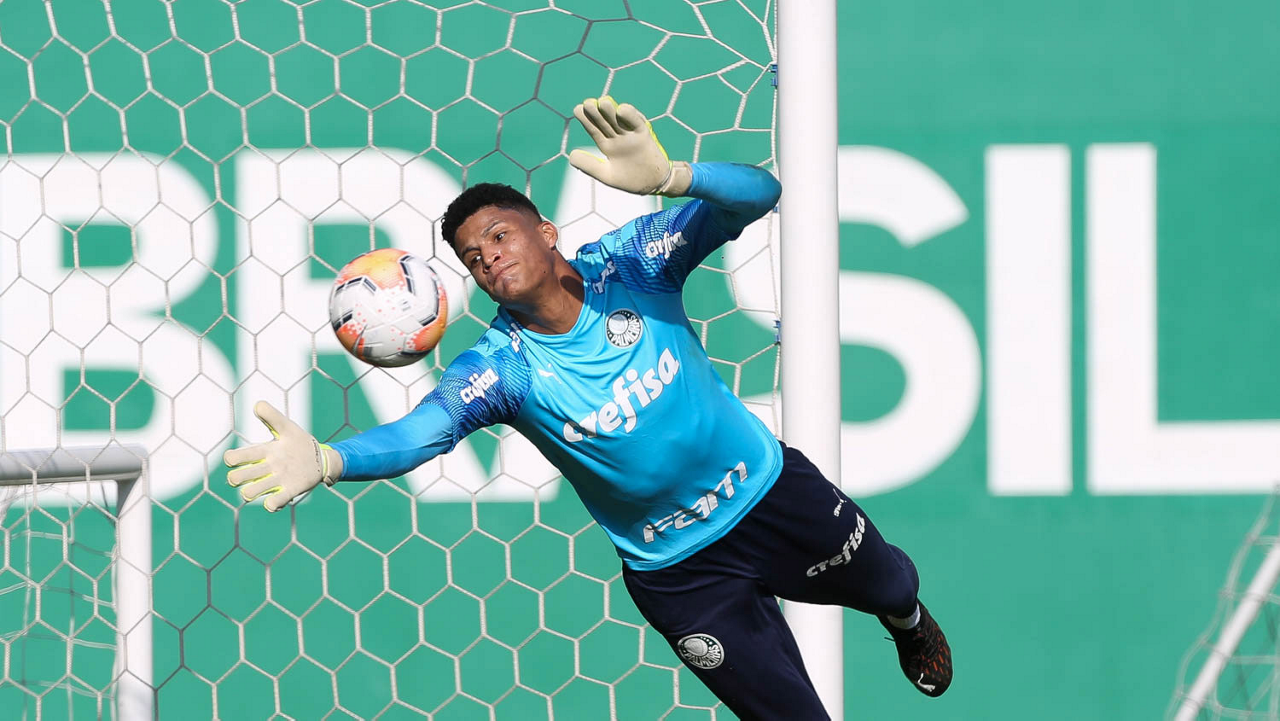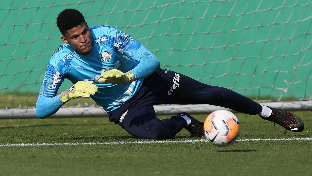 O goleiro Mateus, da SE Palmeiras, durante treinamento, na Academia de Futebol. (Foto: Cesar Greco)
