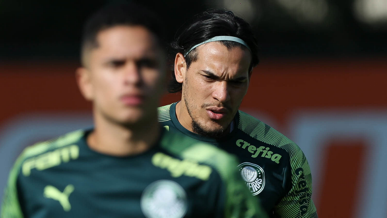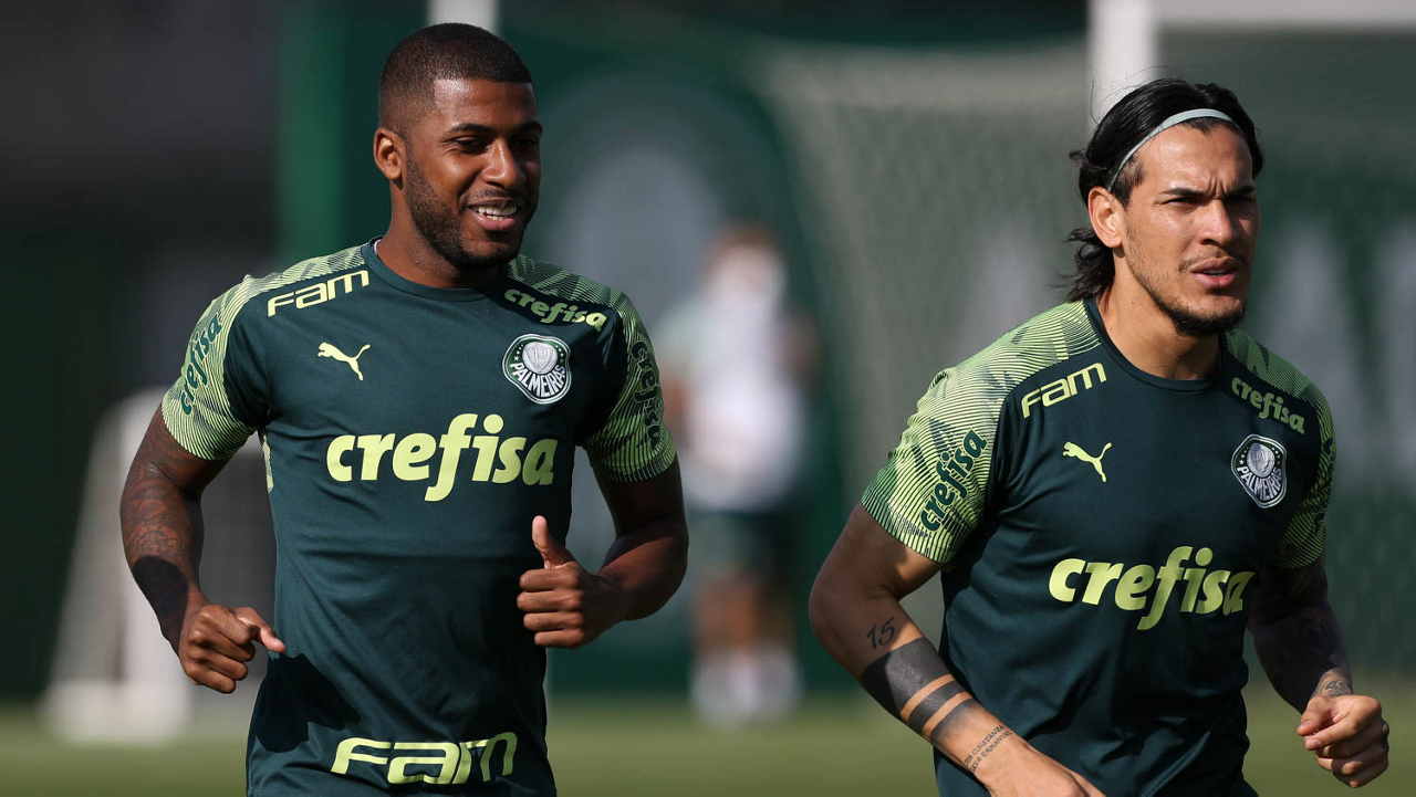 Os jogadores Emerson Santos Gustavo Gómez (D), da SE Palmeiras, durante treinamento, na Academia de Futebol. (Foto: Cesar Greco)
