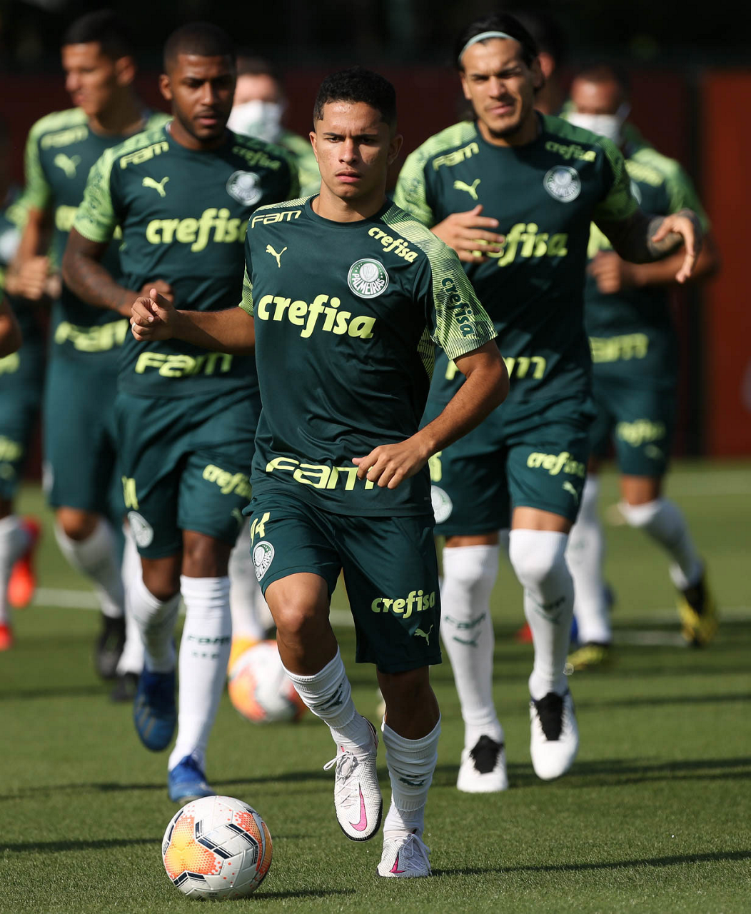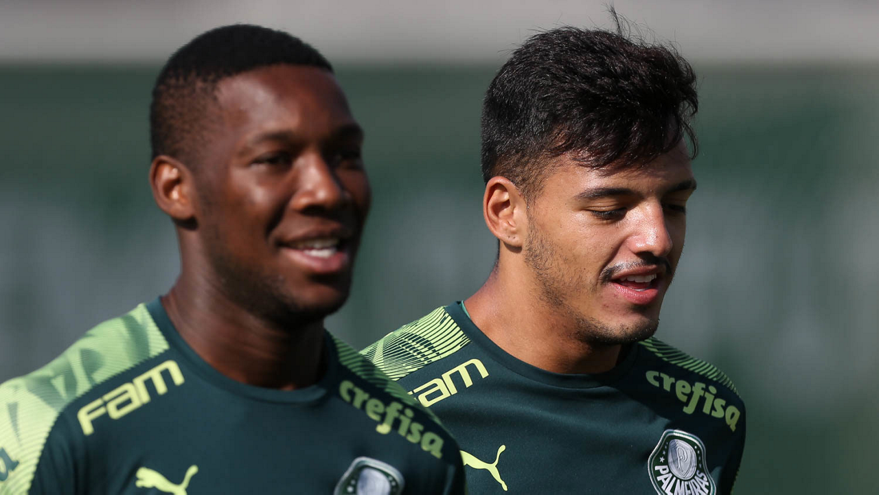 Os jogadores Gabriel Menino e Luan (D), da SE Palmeiras, durante treinamento, na Academia de Futebol. (Foto: Cesar Greco)