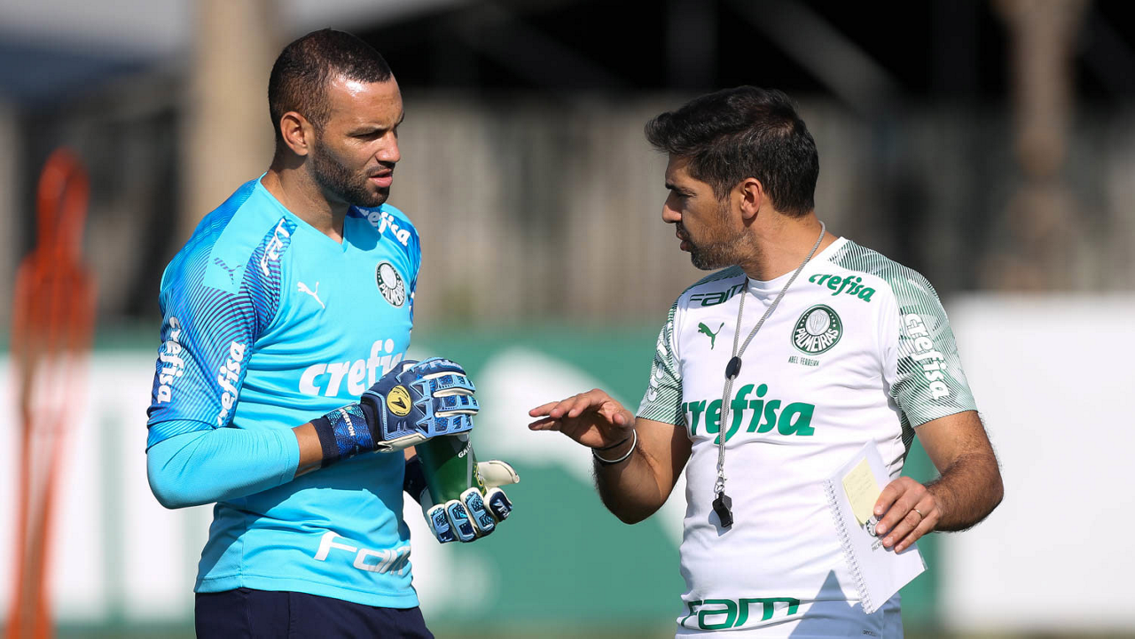 O técnico Abel Ferreira e o goleiro Weverton (E), da SE Palmeiras, durante treinamento, na Academia de Futebol. (Foto: Cesar Greco)