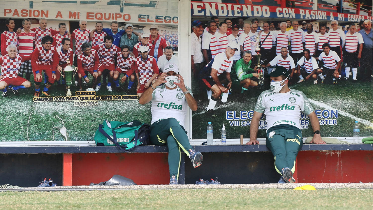 O técnico Abel Ferreira e o médico Pedro Pontin (D), da SE Palmeiras, durante treinamento, no estádio do Elegole, em Manta, no Equador. (Foto: Cesar Greco)