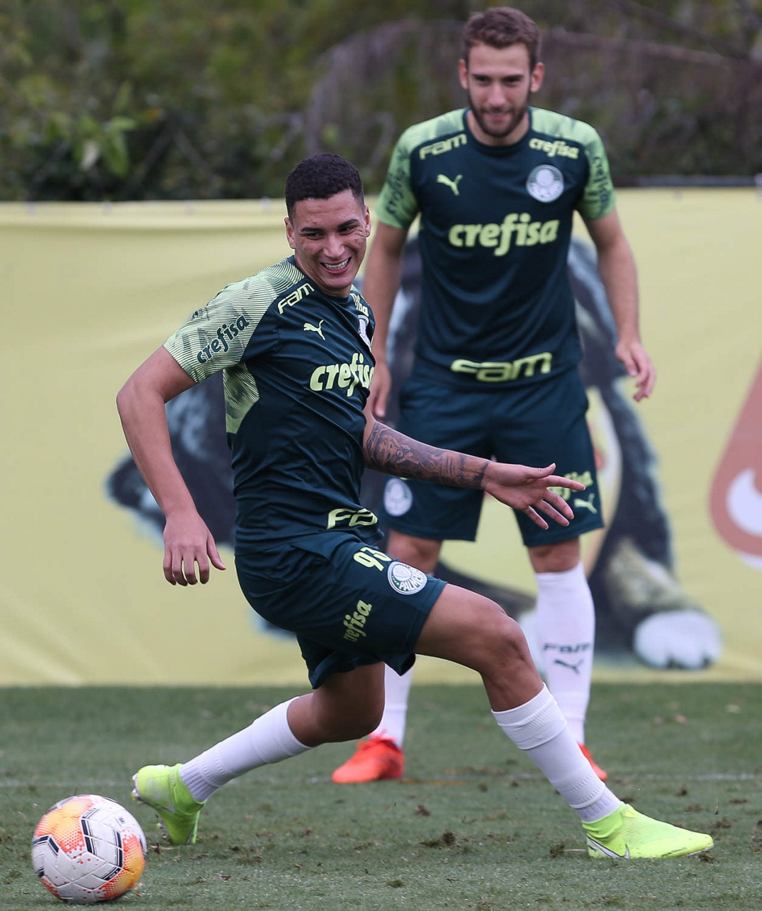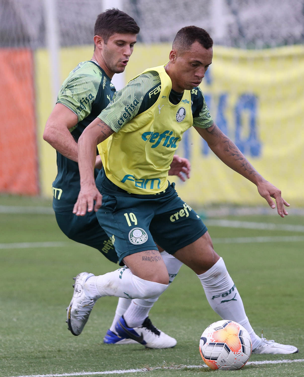 Os jogadores Benjamín Kuscevic e Breno Lopes (D), da SE Palmeiras, durante treinamento, na Academia de Futebol. (Foto: Cesar Greco)