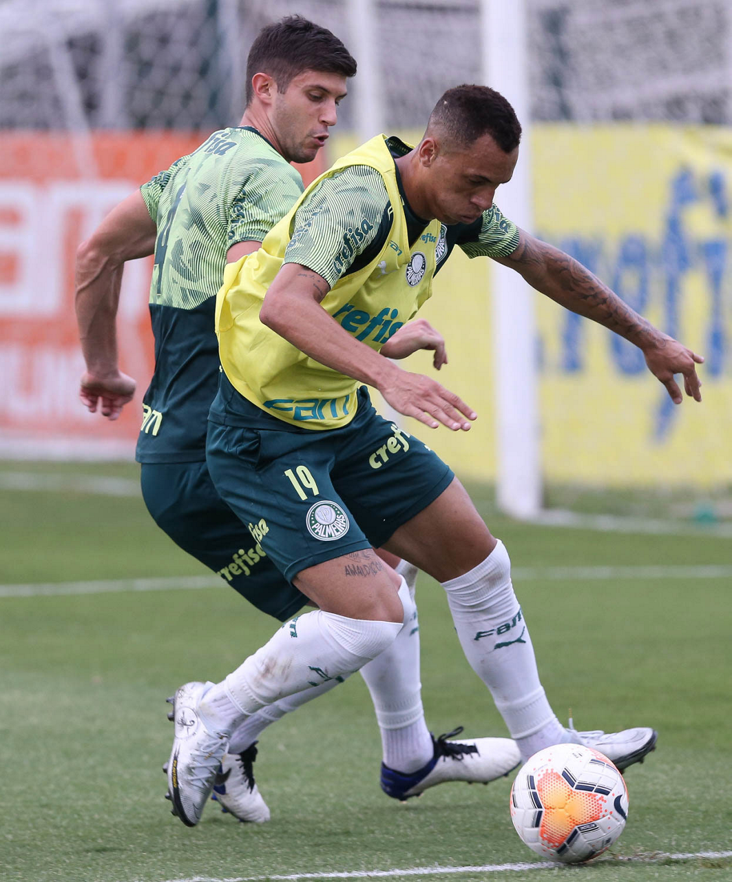 Os jogadores Mayke e Raphael Veiga (D), da SE Palmeiras, durante treinamento, na Academia de Futebol. (Foto: Cesar Greco)