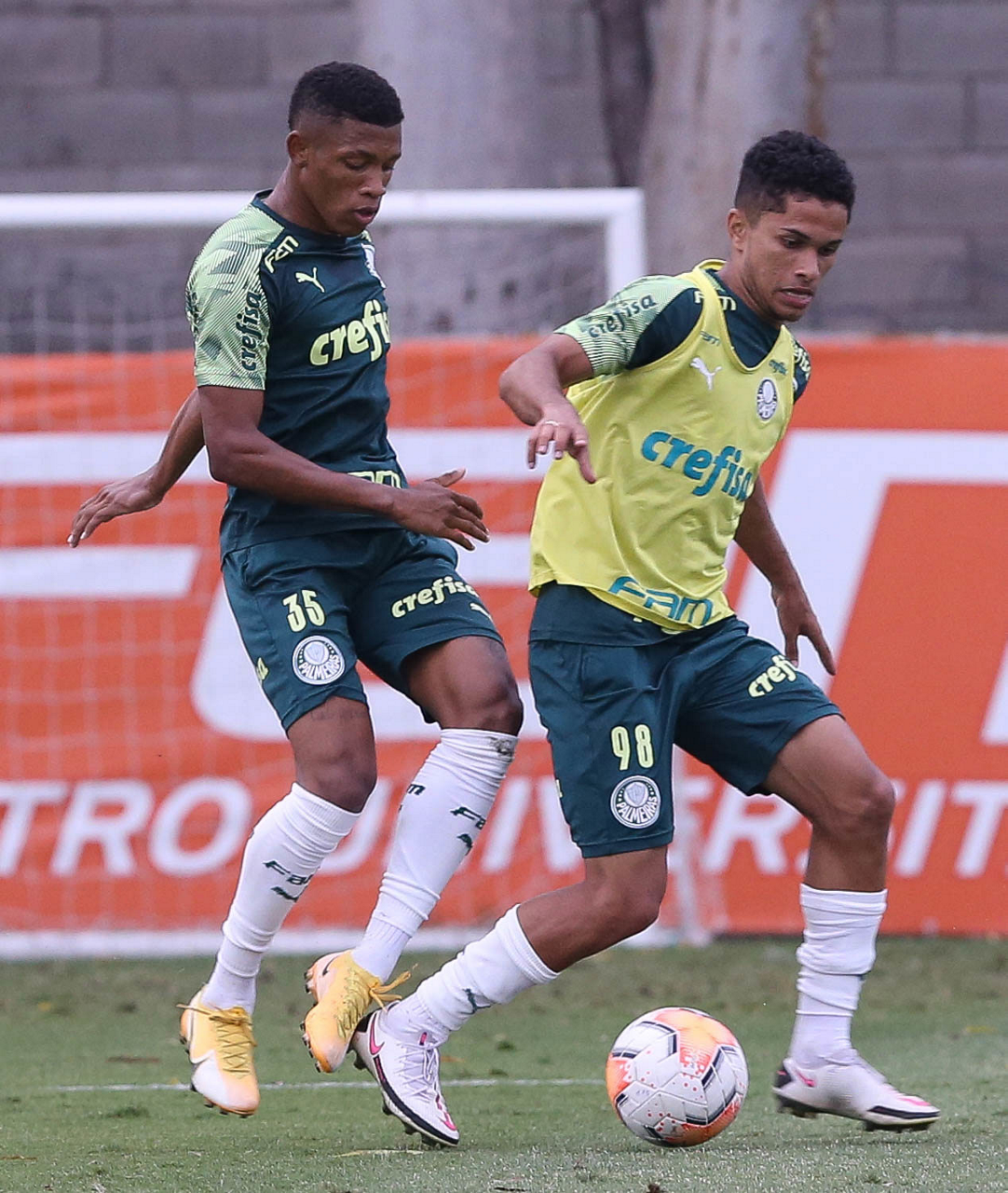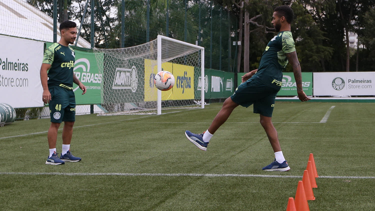 Os jogadores Gabriel Veron e Gabriel Silva (D), da SE Palmeiras, durante treinamento, na Academia de Futebol. (Foto: Cesar Greco)