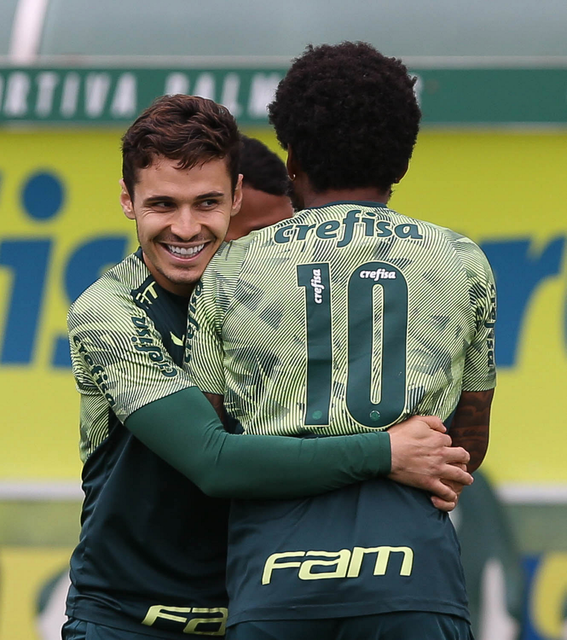 Os jogadores Luiz Adriano e Raphael Veiga (E), da SE Palmeiras, durante treinamento, na Academia de Futebol. (Foto: Cesar Greco)
