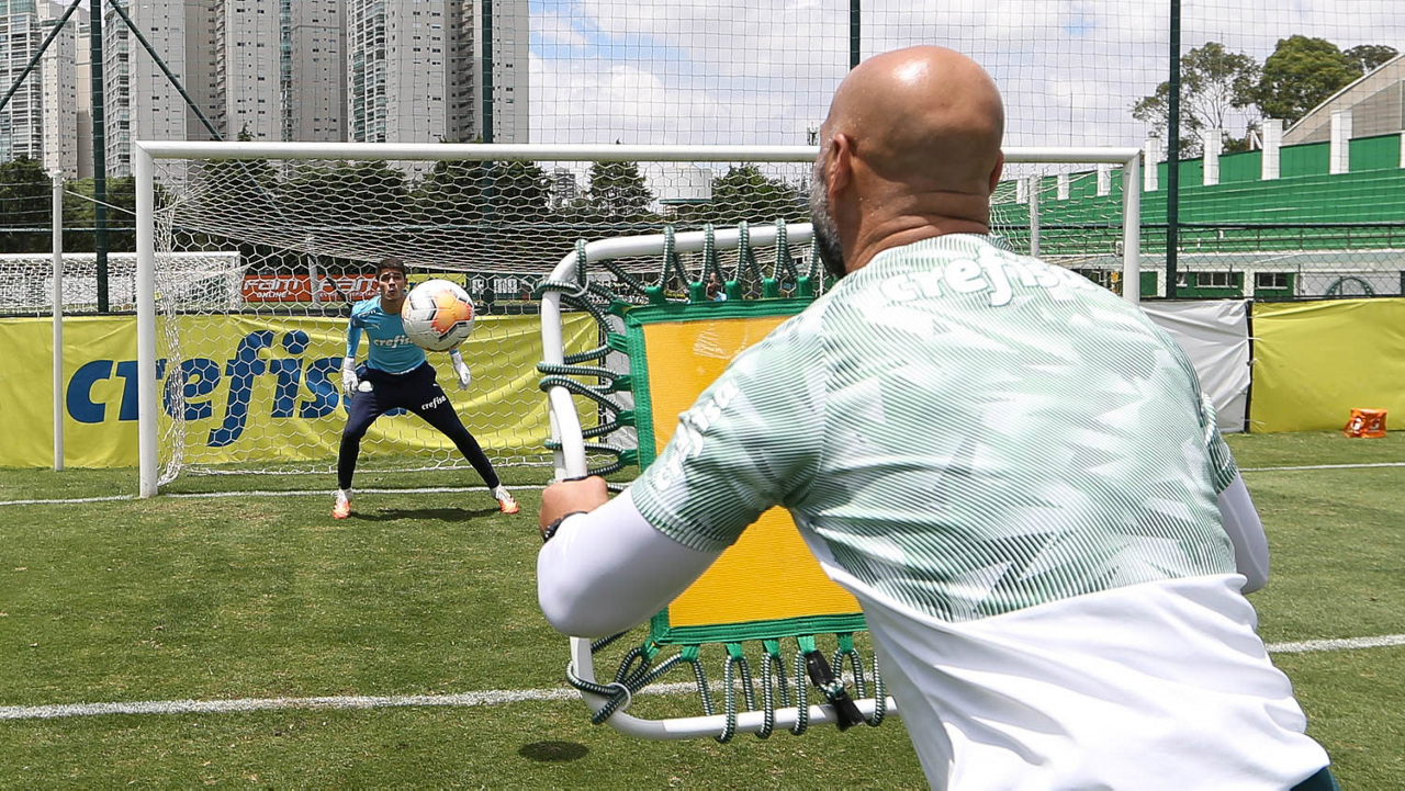 O goleiro Vinicius e o preparador de goleiro Rogerio Godoy (D), da SE Palmeiras, durante treinamento, na Academia de Futebol. (Foto: Cesar Greco)