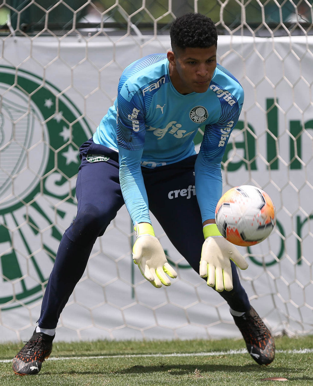 O goleiro Mateus, da SE Palmeiras, durante treinamento, na Academia de Futebol. (Foto: Cesar Greco)