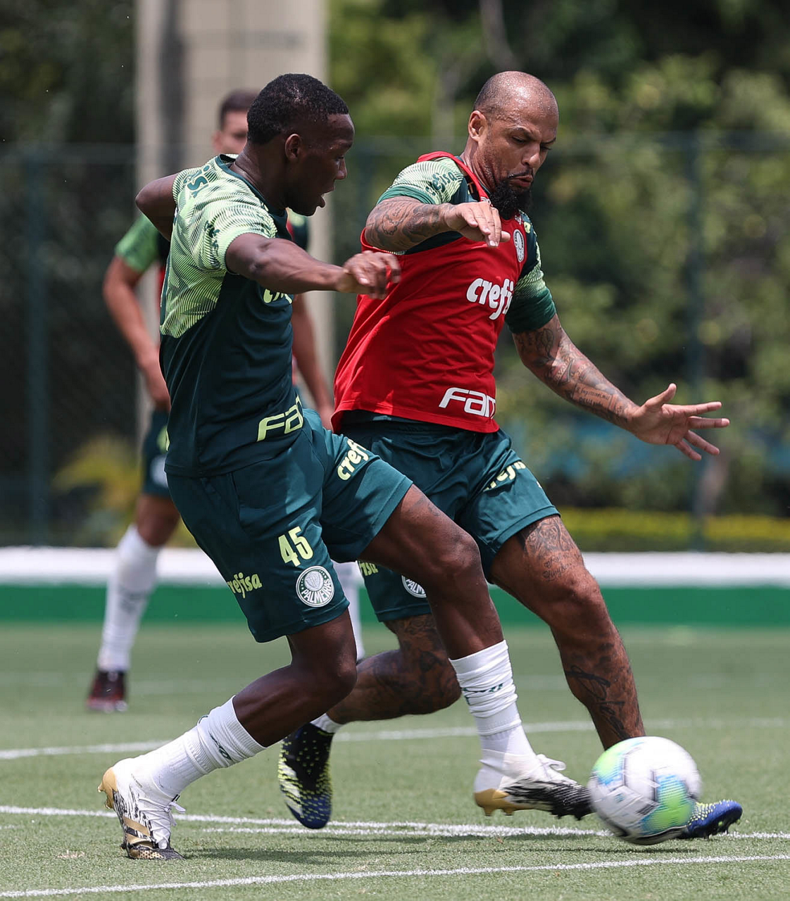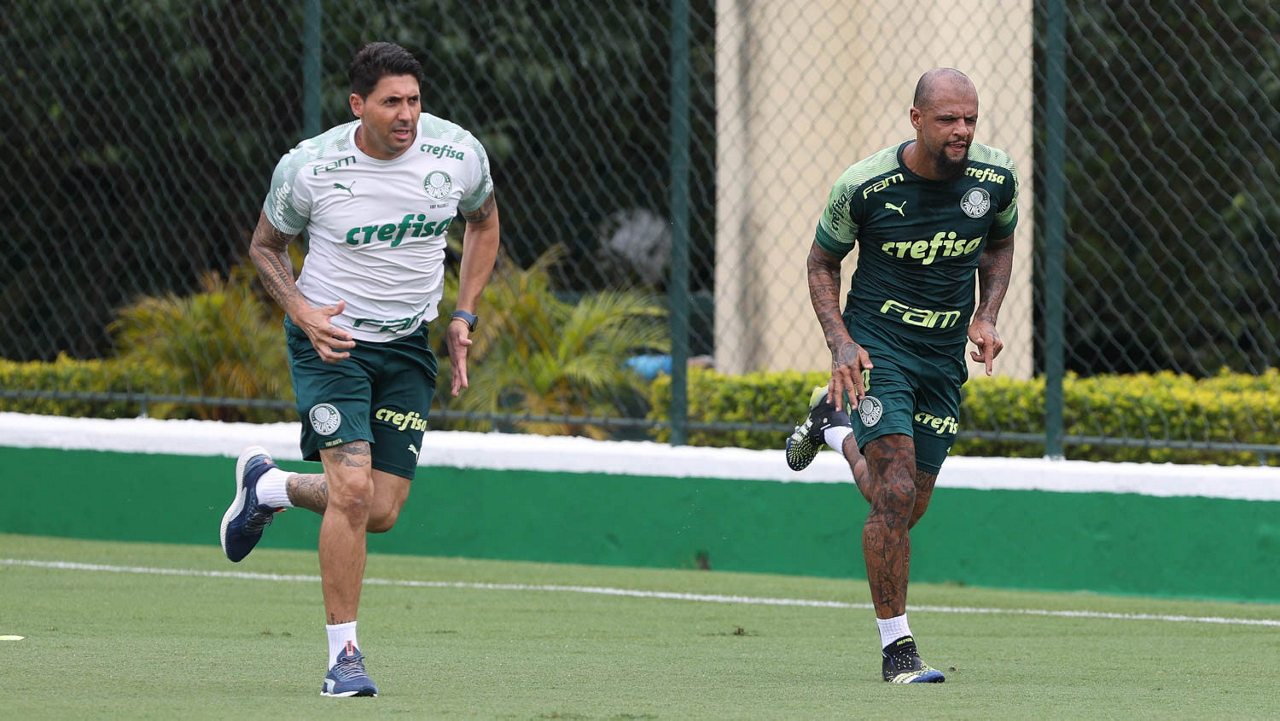 Os jogadores Patrick de Paula e Felipe Melo (D), da SE Palmeiras, durante treinamento, na Academia de Futebol. (Foto: Cesar Greco)