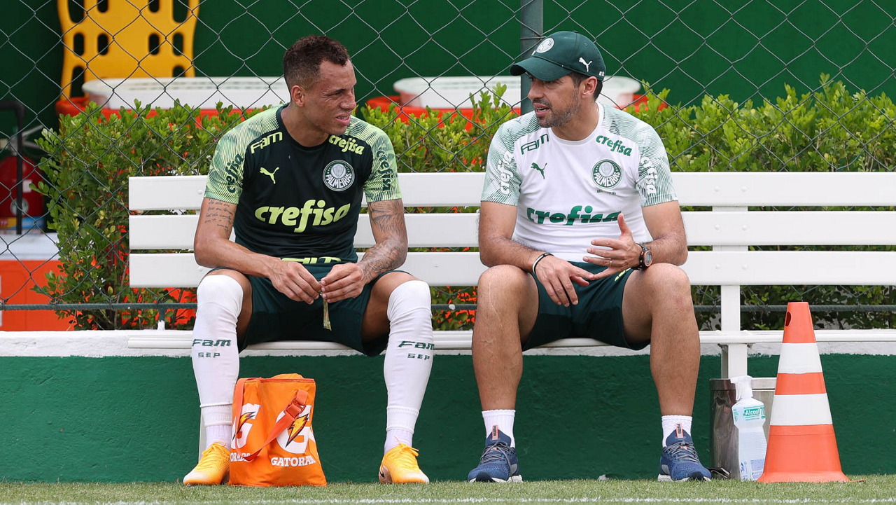 O técnico Abel Ferreira e o jogador Breno Lopes (E), da SE Palmeiras, durante treinamento, na Academia de Futebol. (Foto: Cesar Greco)