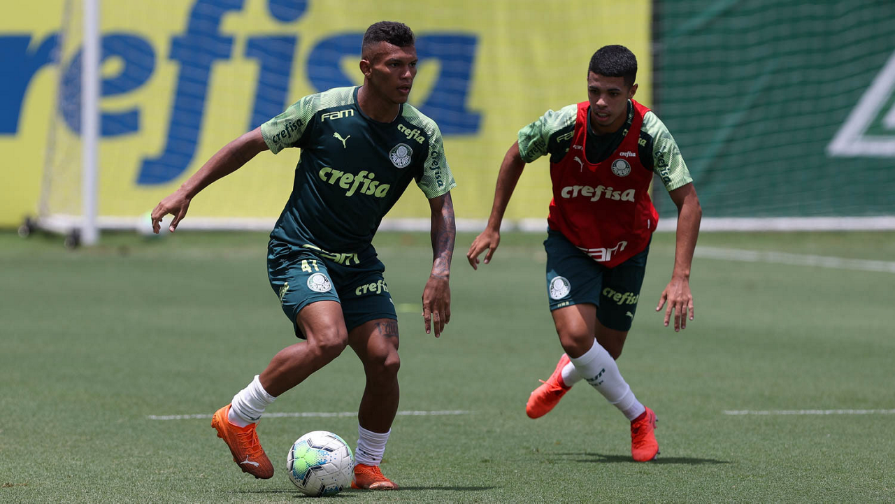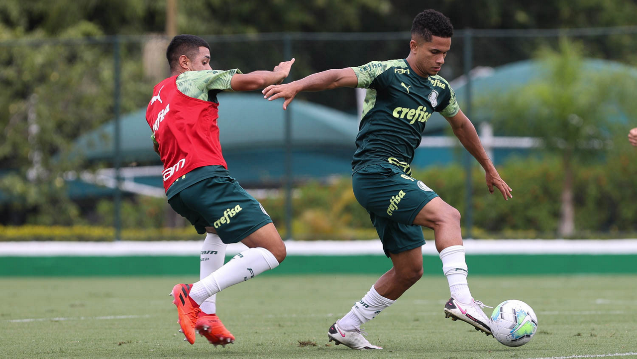 O jogador Gabriel Silva (D), da SE Palmeiras, durante treinamento, na Academia de Futebol. (Foto: Cesar Greco)