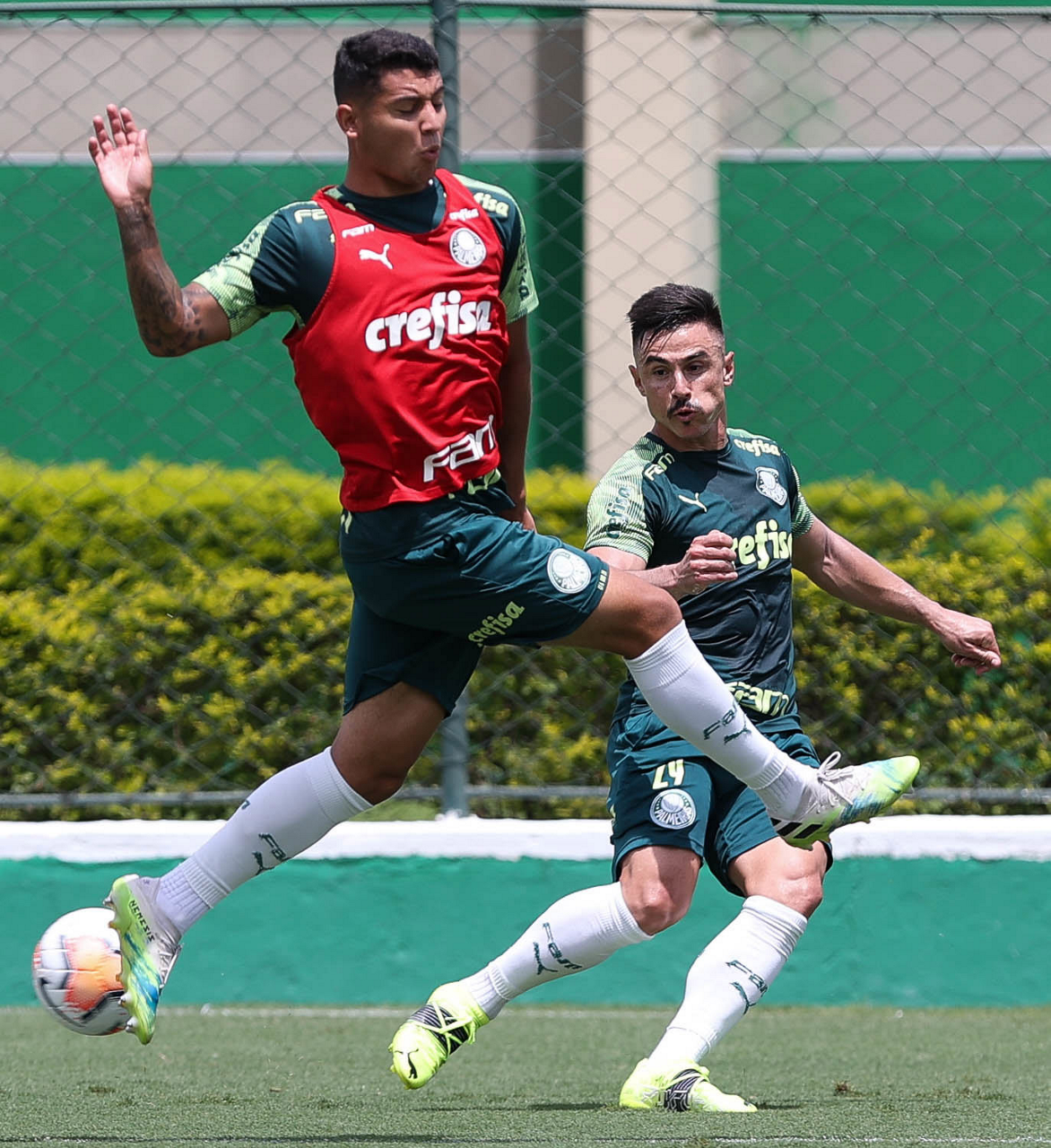 Os jogadores Rony e Gabriel Menino (D), da SE Palmeiras, durante treinamento, na Academia de Futebol. (Foto: Cesar Greco)