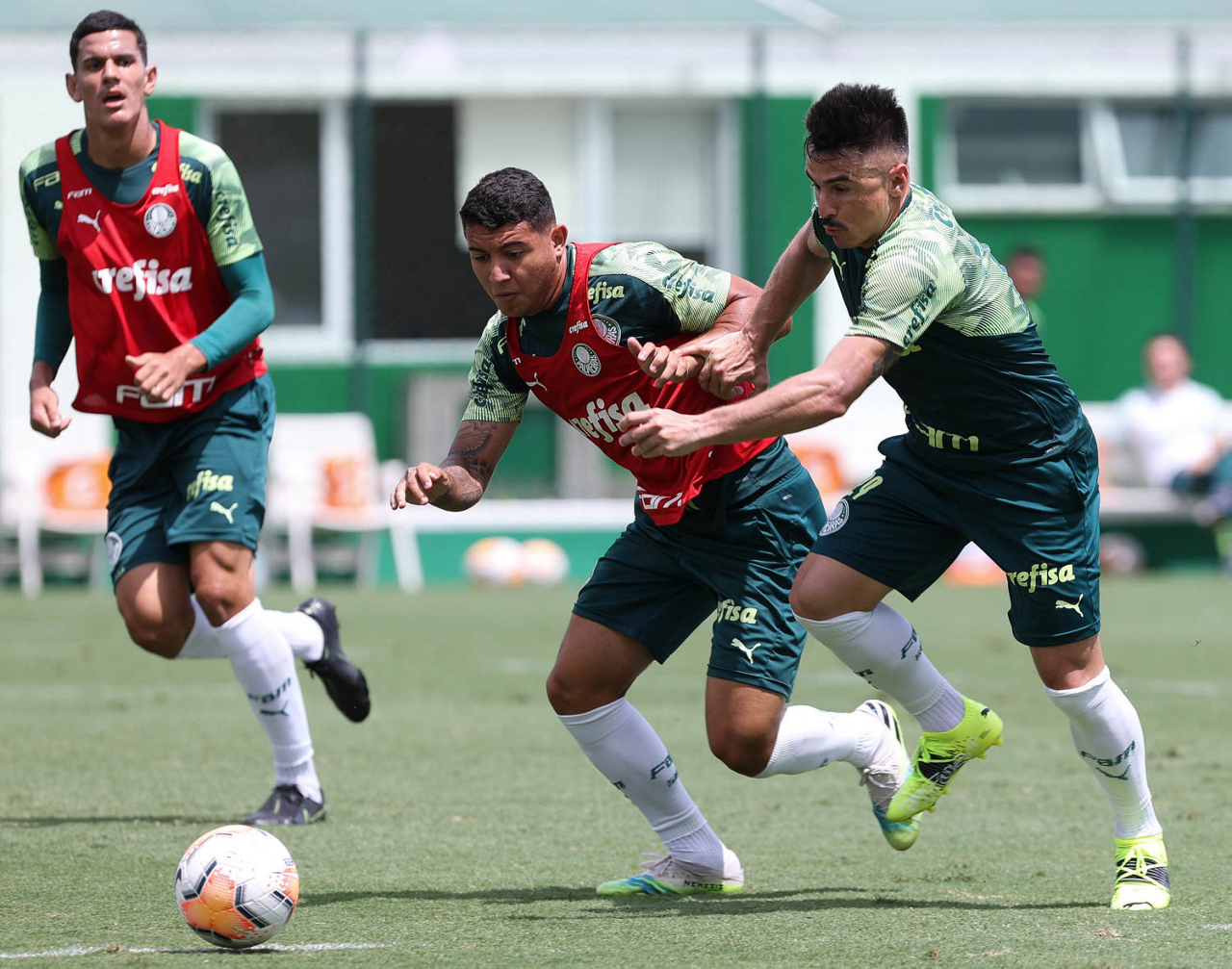 Os jogadores Lucas Lima e Mayke e o goleiro Weverton (E/D), da SE Palmeiras, durante treinamento, na Academia de Futebol. (Foto: Cesar Greco)