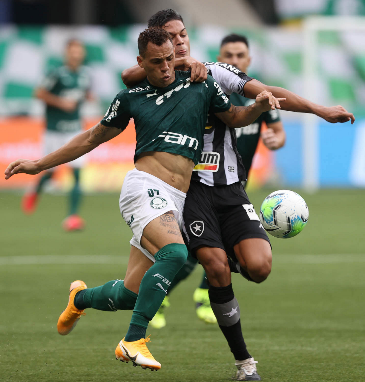 O jogador Breno Lopes, da SE Palmeiras, disputa bola com o jogador, do Botafogo FR, durante partida válida pela trigésima quarta rodada, do Campeonato Brasileiro, Série A, na arena Allianz Parque. (Foto: Cesar Greco)