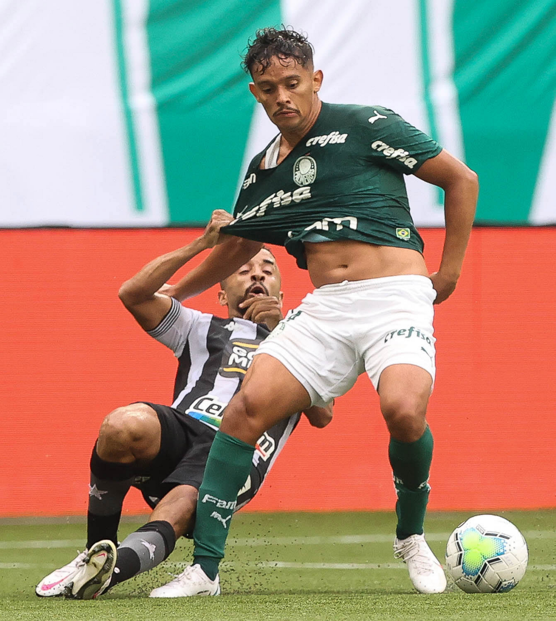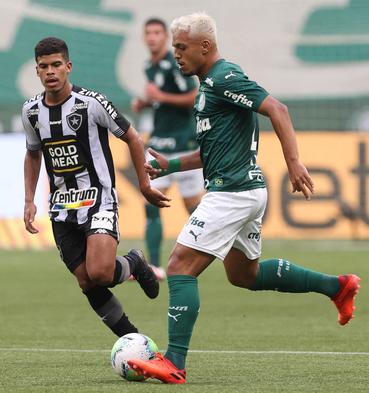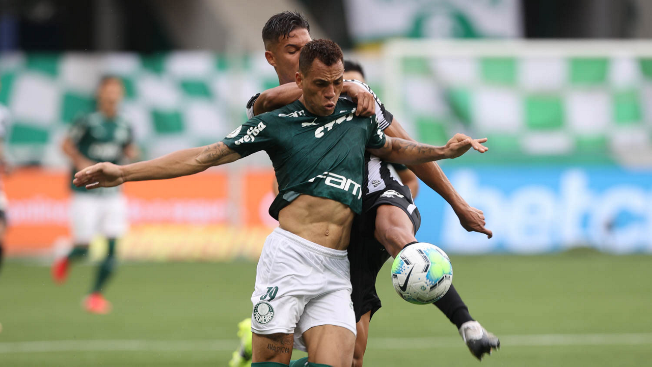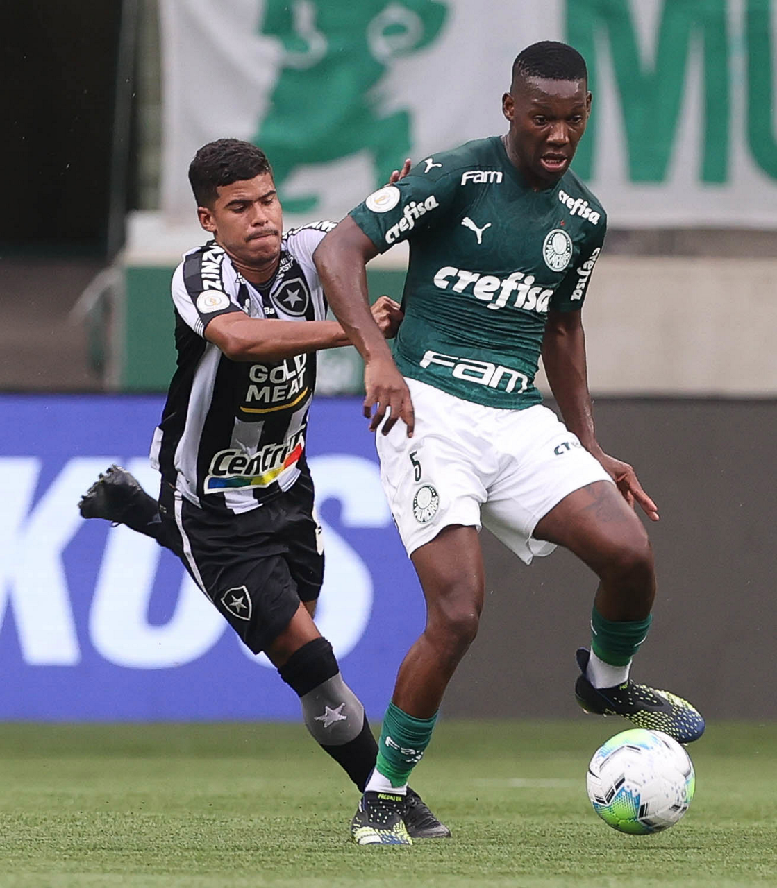 O jogador Gabriel Menino, da SE Palmeiras, disputa bola com o jogador, do Botafogo FR, durante partida válida pela trigésima quarta rodada, do Campeonato Brasileiro, Série A, na arena Allianz Parque. (Foto: Cesar Greco)