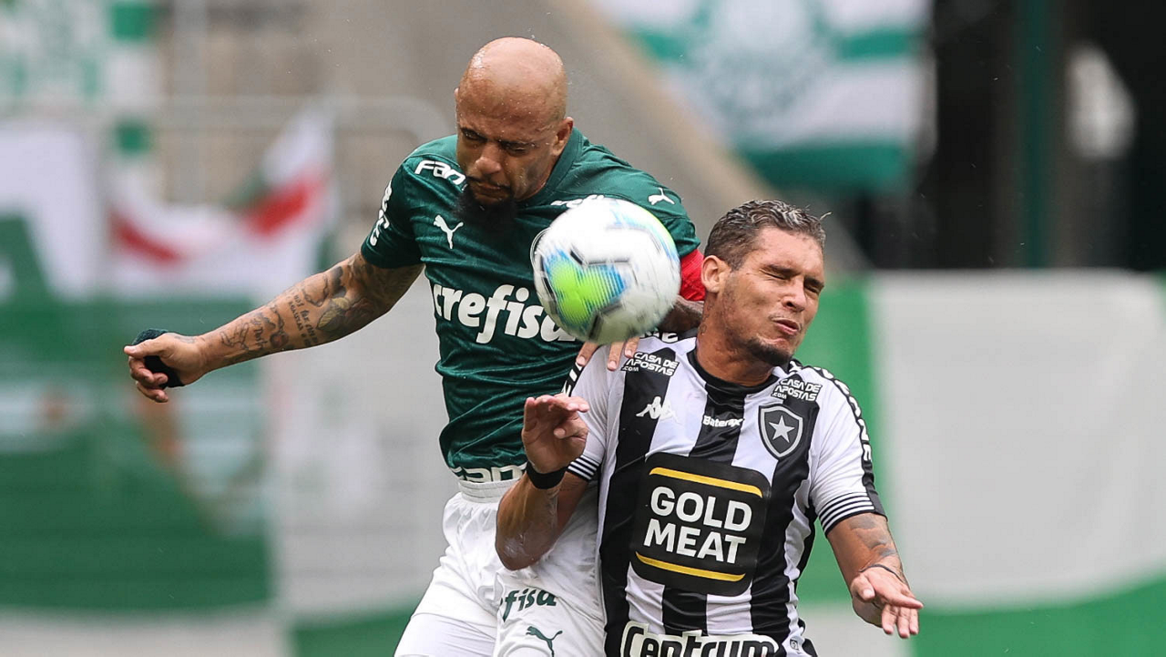 O jogador Felipe Melo, da SE Palmeiras, disputa bola com o jogador, do Botafogo FR, durante partida válida pela trigésima quarta rodada, do Campeonato Brasileiro, Série A, na arena Allianz Parque. (Foto: Cesar Greco)