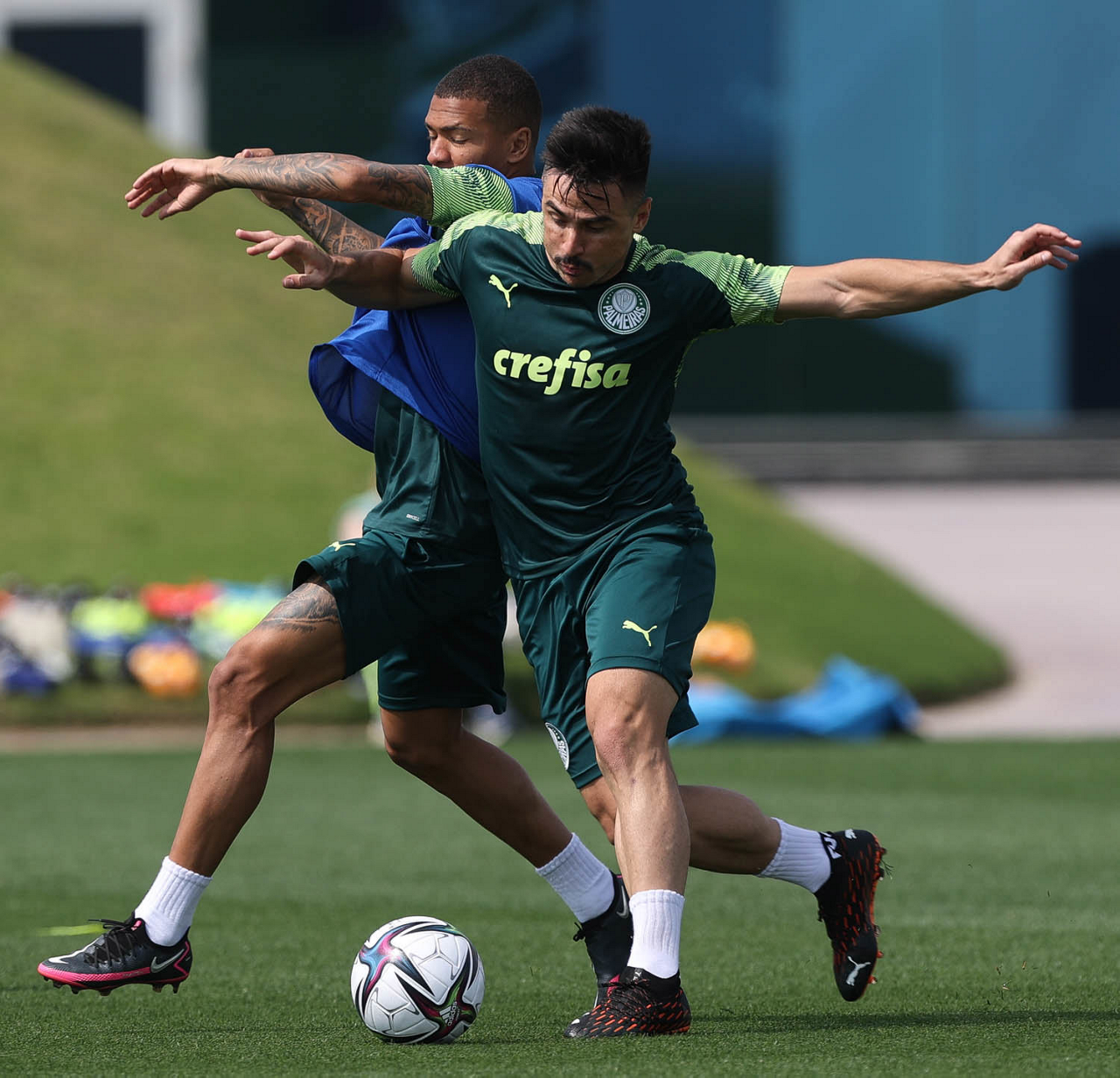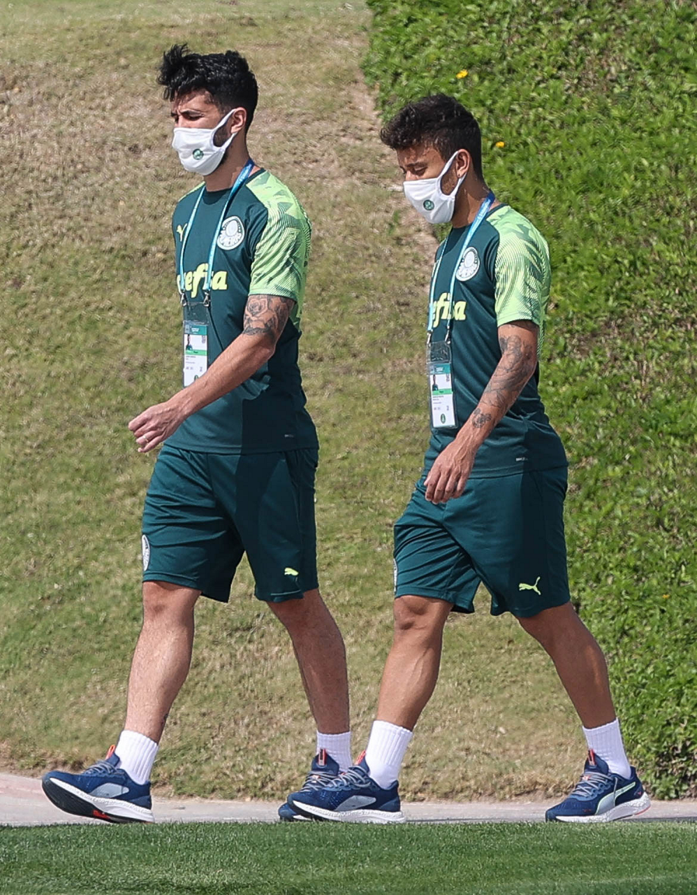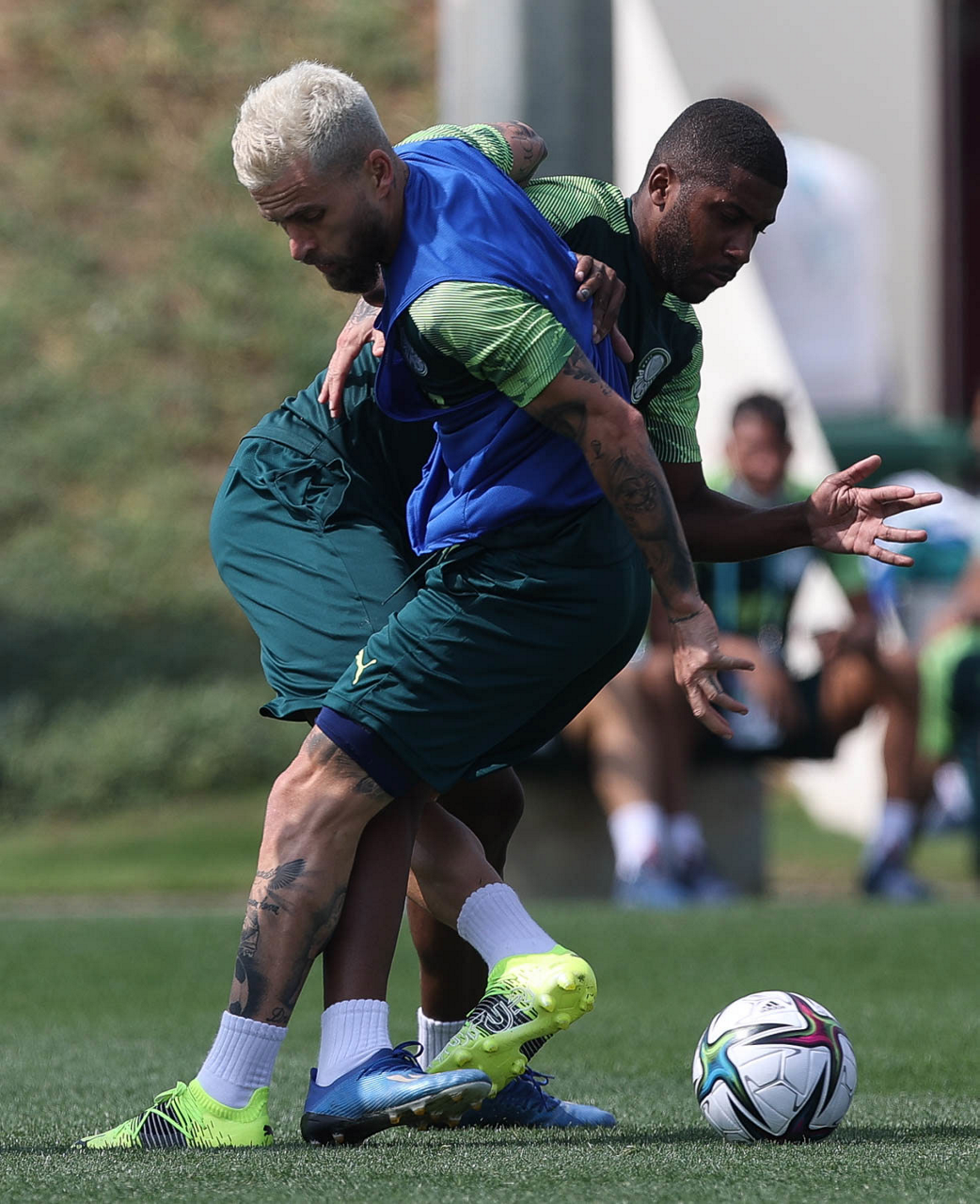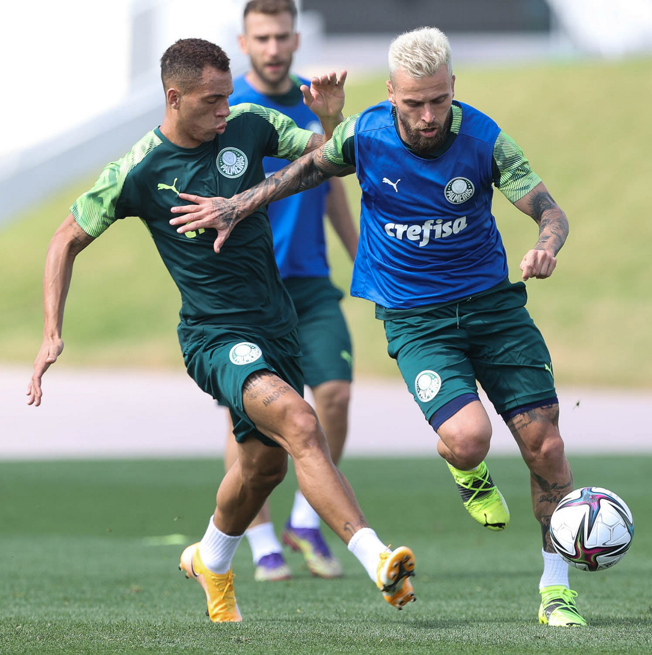 Os jogadores Gustavo Scarpa e Mayke (D), da SE Palmeiras, durante treinamento, em Doha, no Catar. (Foto: Cesar Greco)