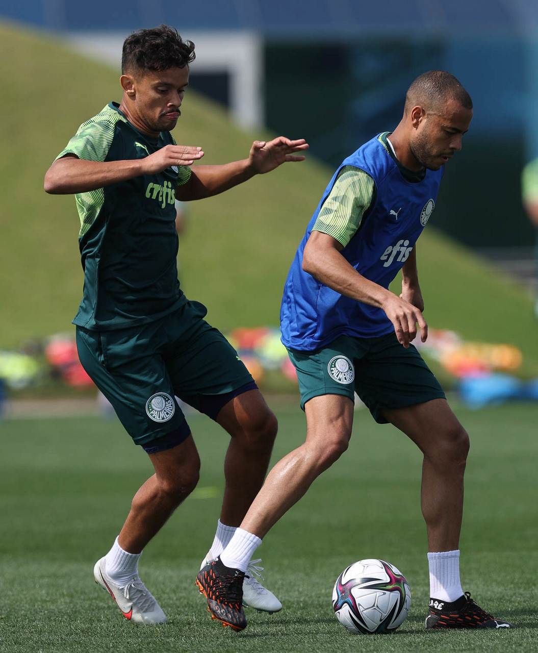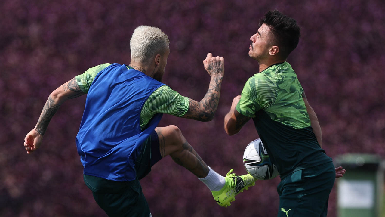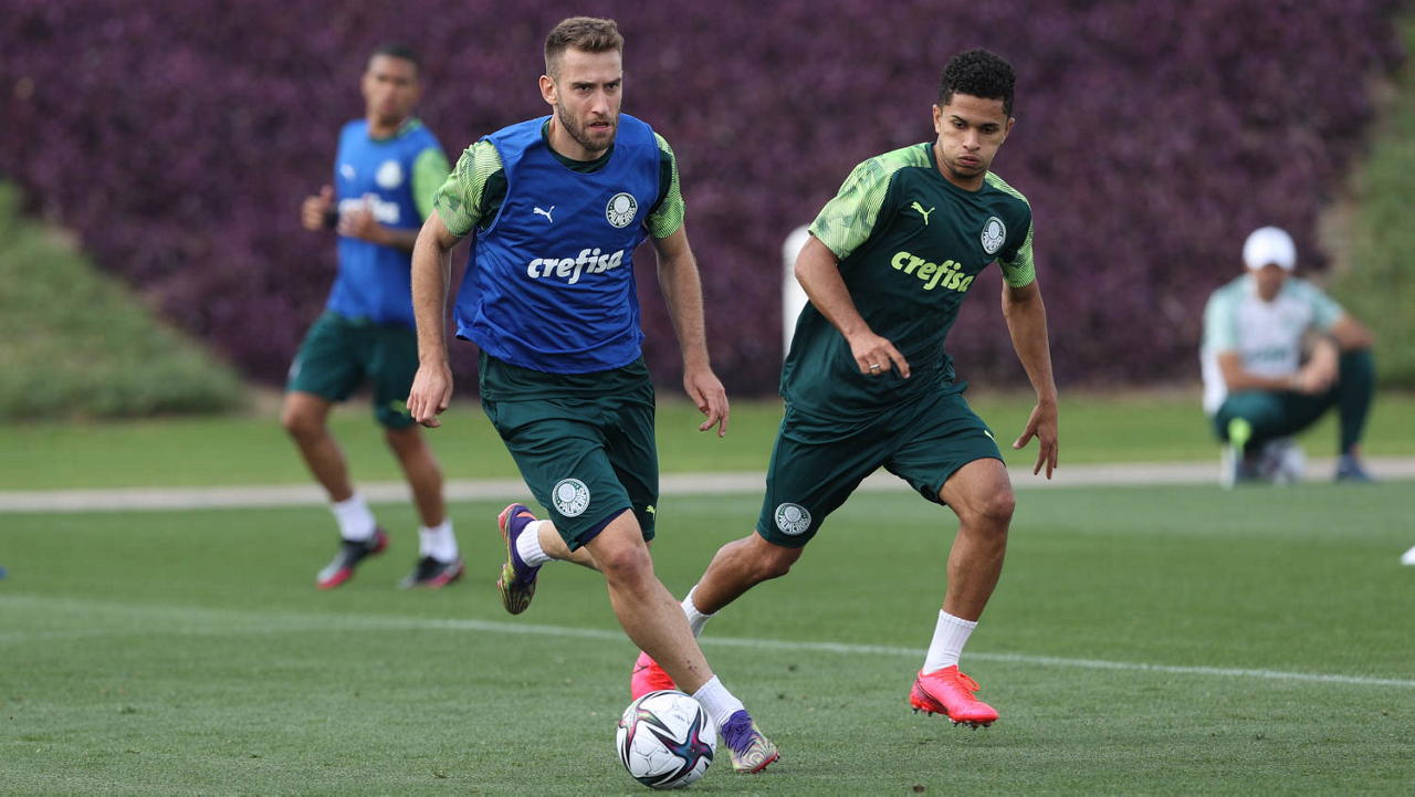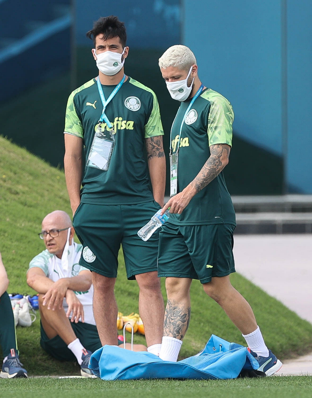 Os jogadores Gustavo Scarpa e Mayke (D), da SE Palmeiras, durante treinamento, em Doha, no Catar. (Foto: Cesar Greco)
