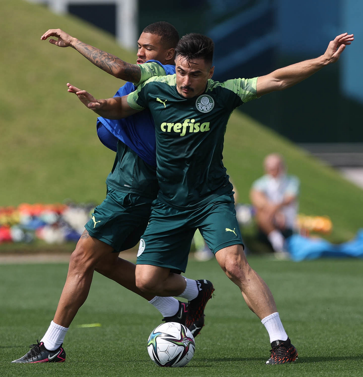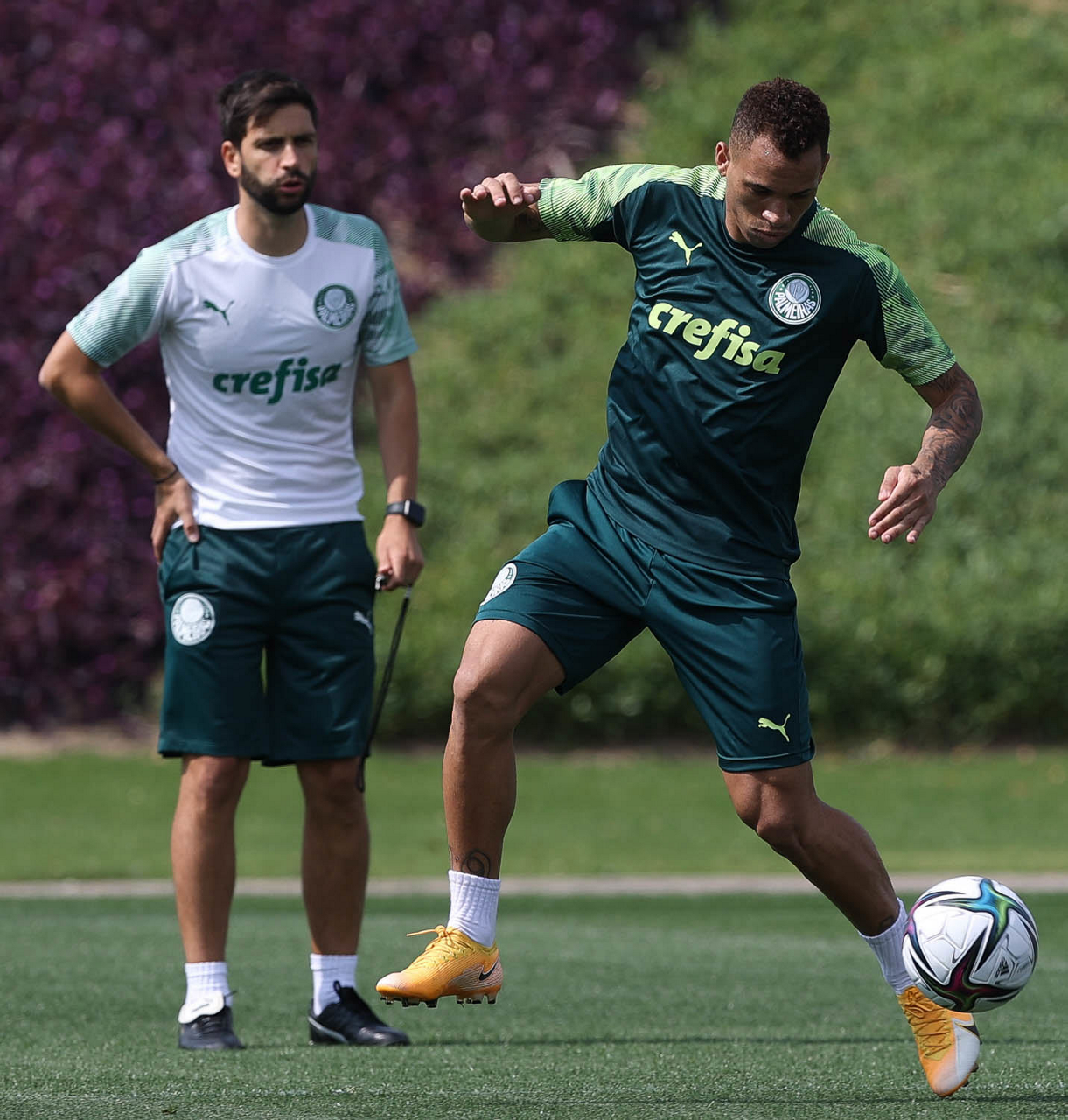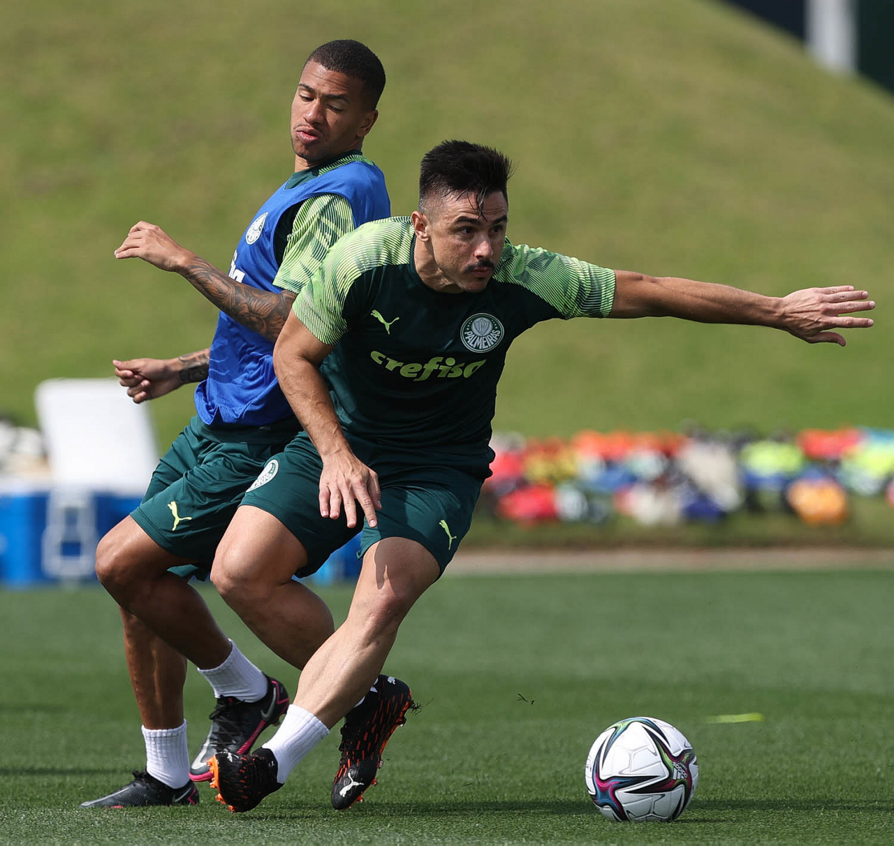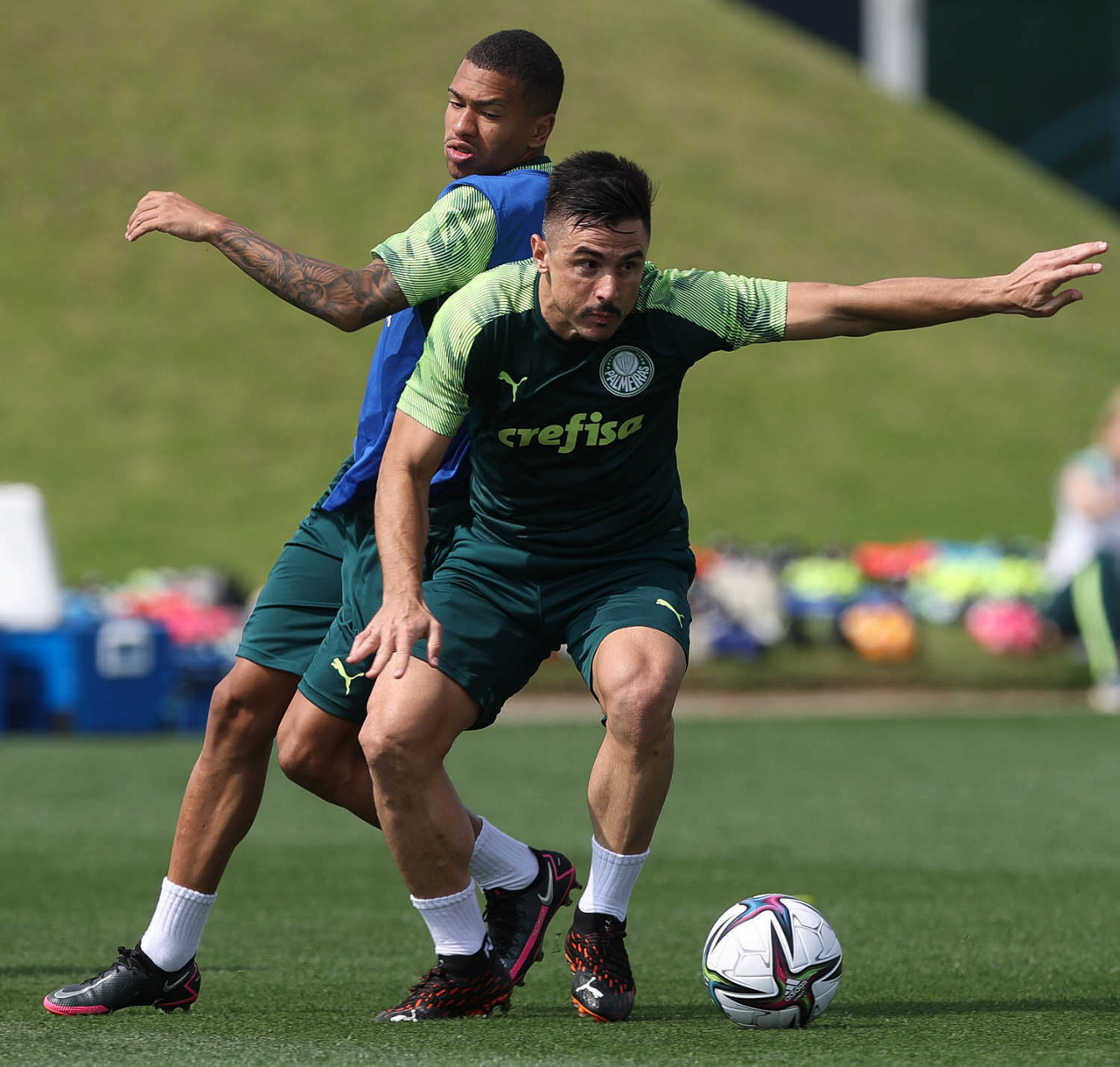 Os jogadores Gustavo Scarpa e Mayke (D), da SE Palmeiras, durante treinamento, em Doha, no Catar. (Foto: Cesar Greco)