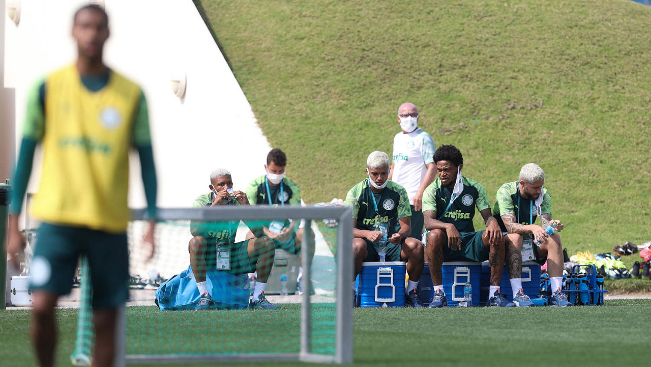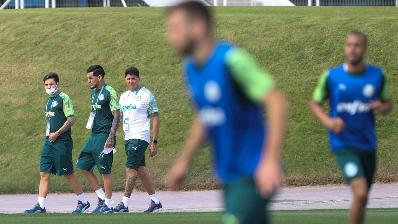 Os jogadores Danilo, Gabriel Menino, Luiz Adriano e Zé Rafael e o massagista Alan (E/D), da SE Palmeiras, durante treinamento, em Doha, no Catar. (Foto: Cesar Greco)