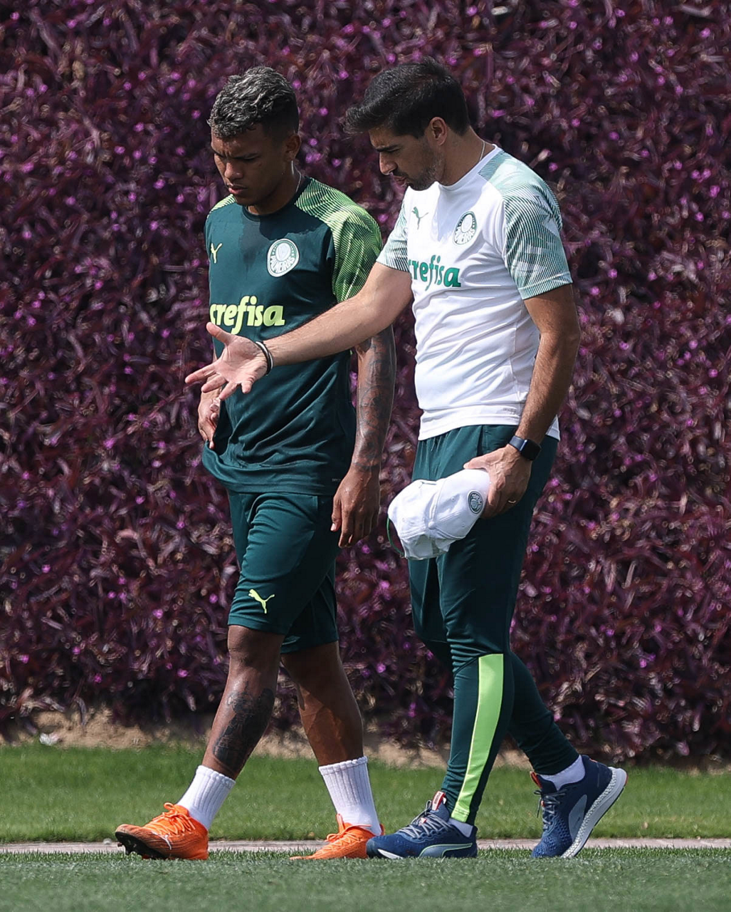 O técnico Abel Ferreira e o jogador Gabriel Veron (E), da SE Palmeiras, durante treinamento, em Doha, no Catar. (Foto: Cesar Greco)