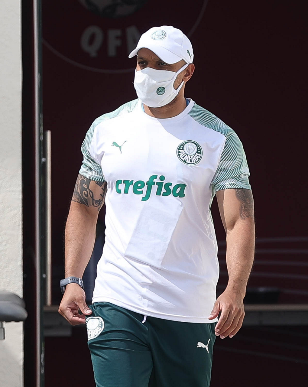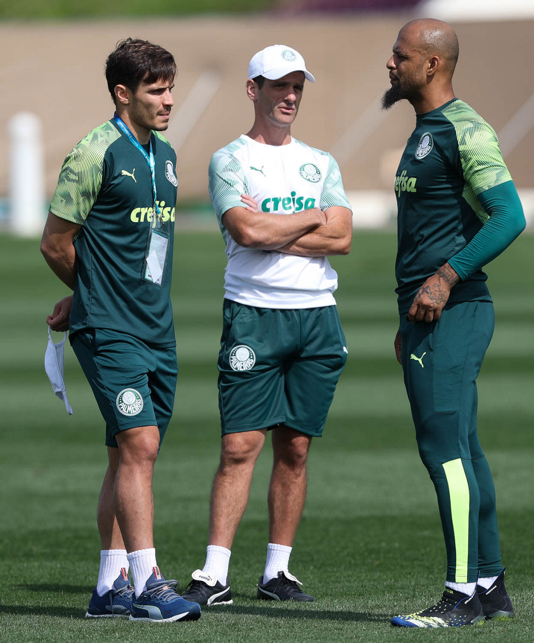 Os jogadores Raphael Veiga e Felipe Melo (E e D) e o preparador físico Marco Aurélio (C), da SE Palmeiras, durante treinamento, em Doha, no Catar. (Foto: Cesar Greco)