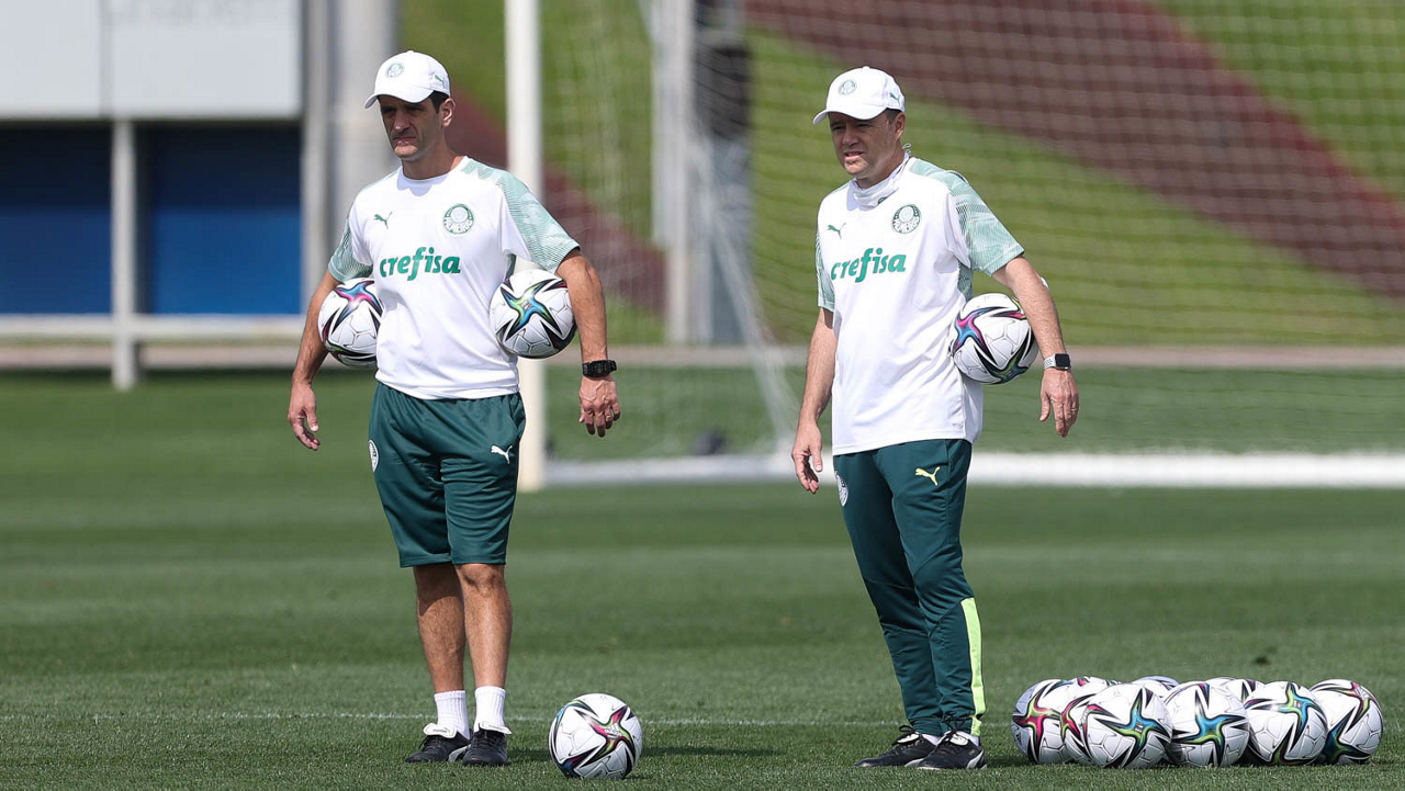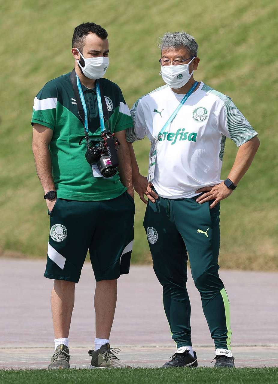O preparador físico Marco Aurélio e o auxiliar técnico Andrey Lopes (D), da SE Palmeiras, durante treinamento, em Doha, no Catar. (Foto: Cesar Greco)