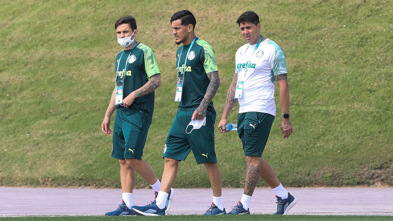 Os jogadores Raphael Veiga e Gustavo Gómez e o fisiologista Rudy Pracidelli (E/D), da SE Palmeiras, durante treinamento, em Doha, no Catar. (Foto: Cesar Greco)