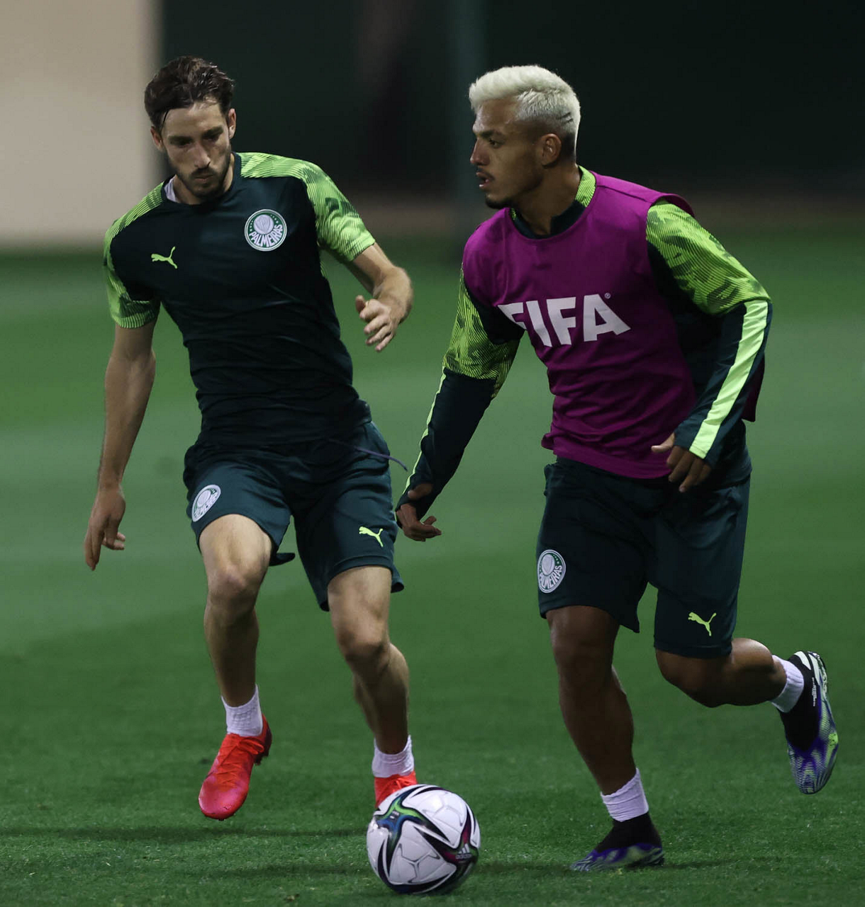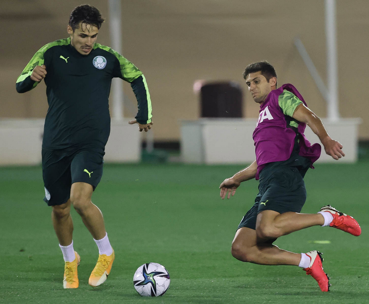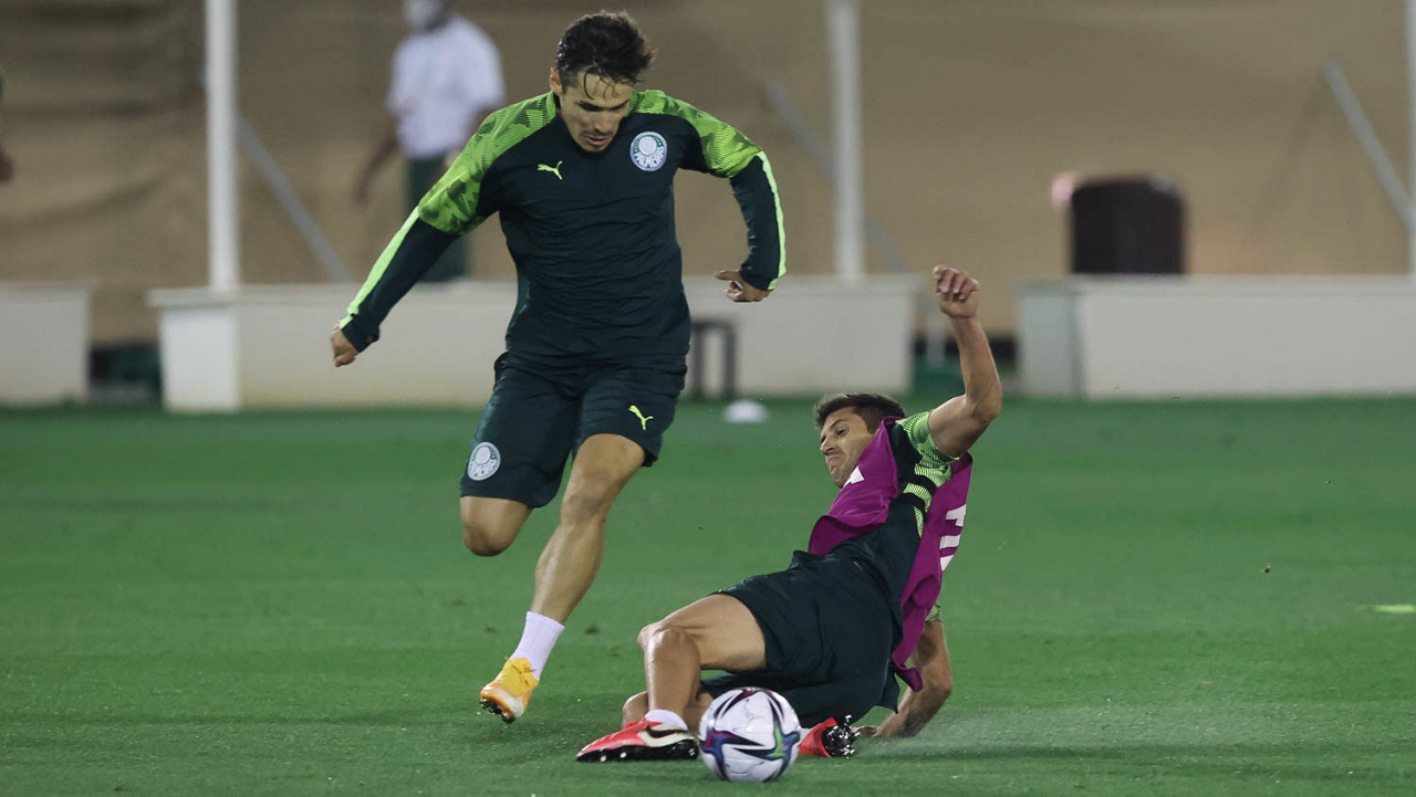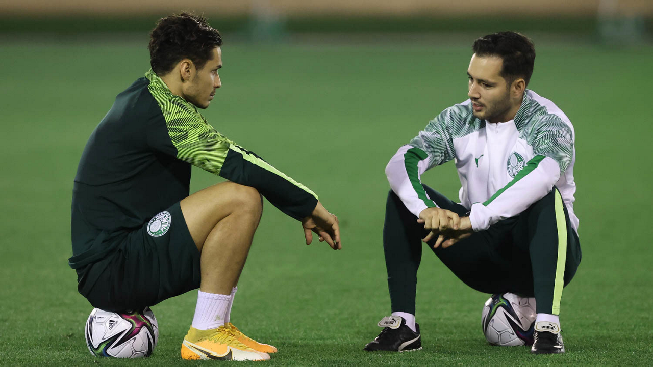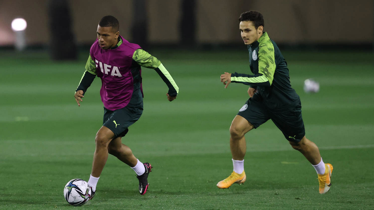 Os jogadores Gabriel Menino e Patrick de Paula (D), da SE Palmeiras, durante treinamento, em Doha, no Catar. (Foto: Cesar Greco)