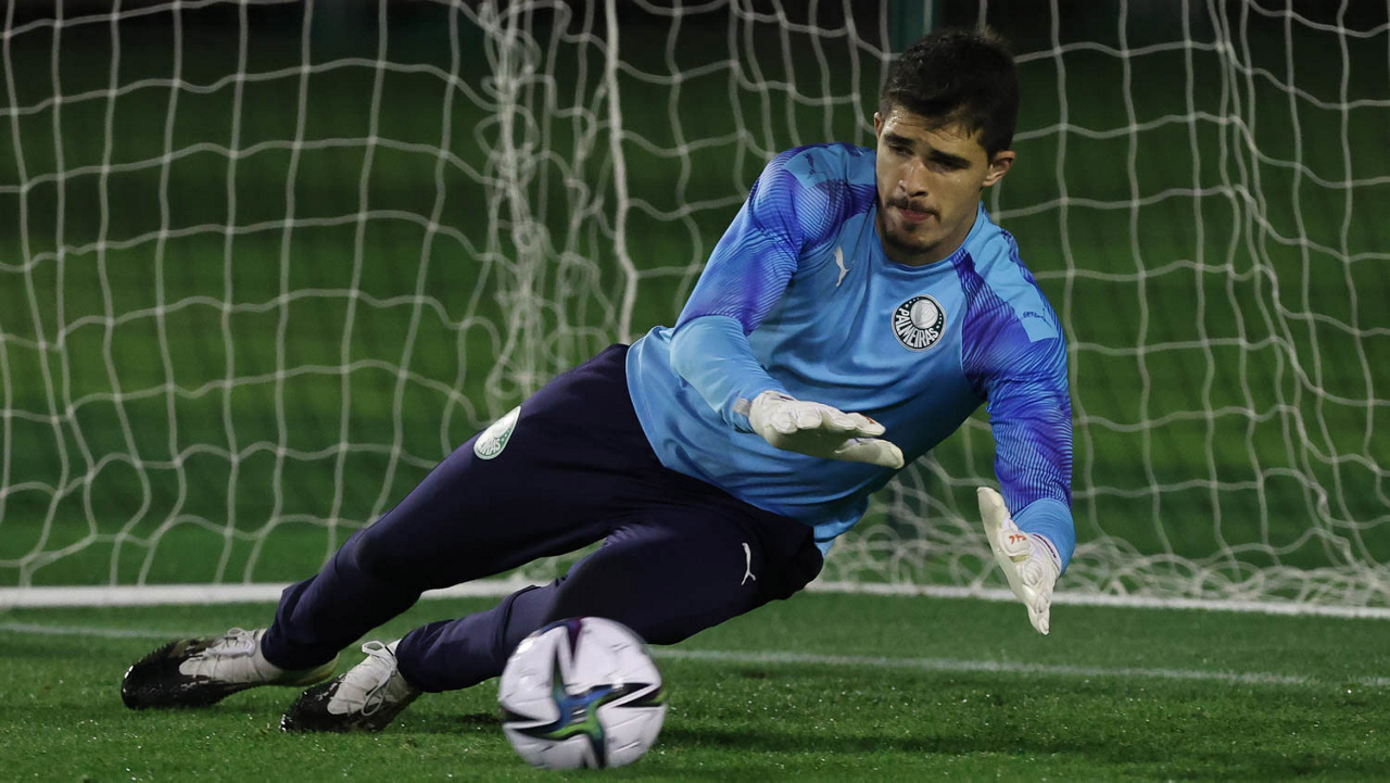 O goleiro Vinicius, da SE Palmeiras, durante treinamento, em Doha, no Catar. (Foto: Cesar Greco)