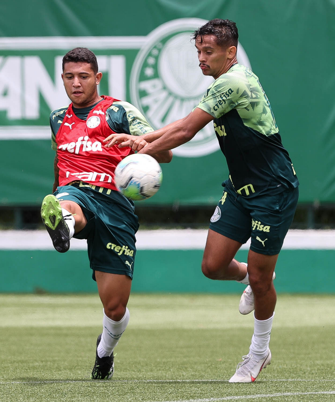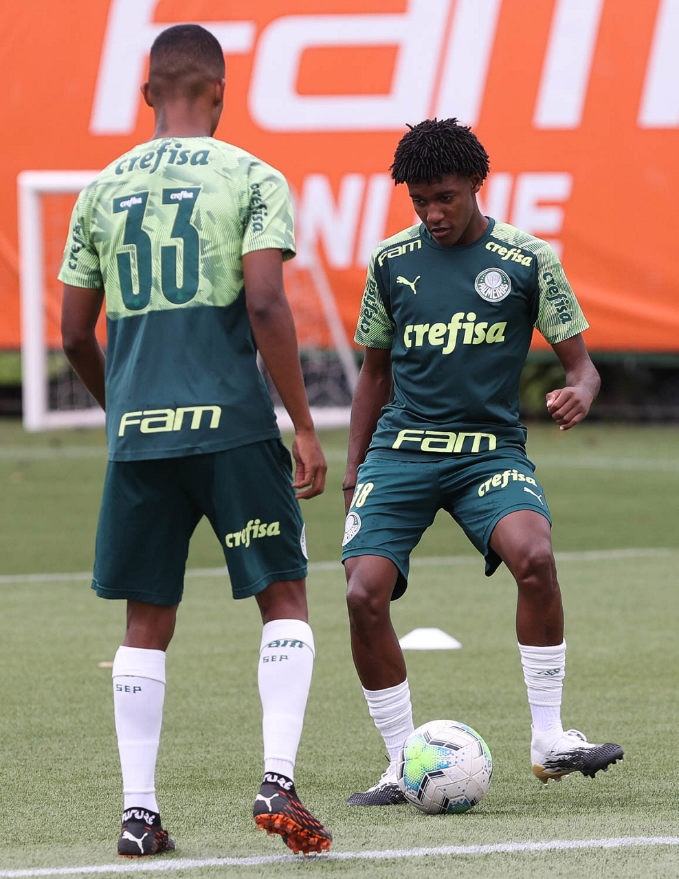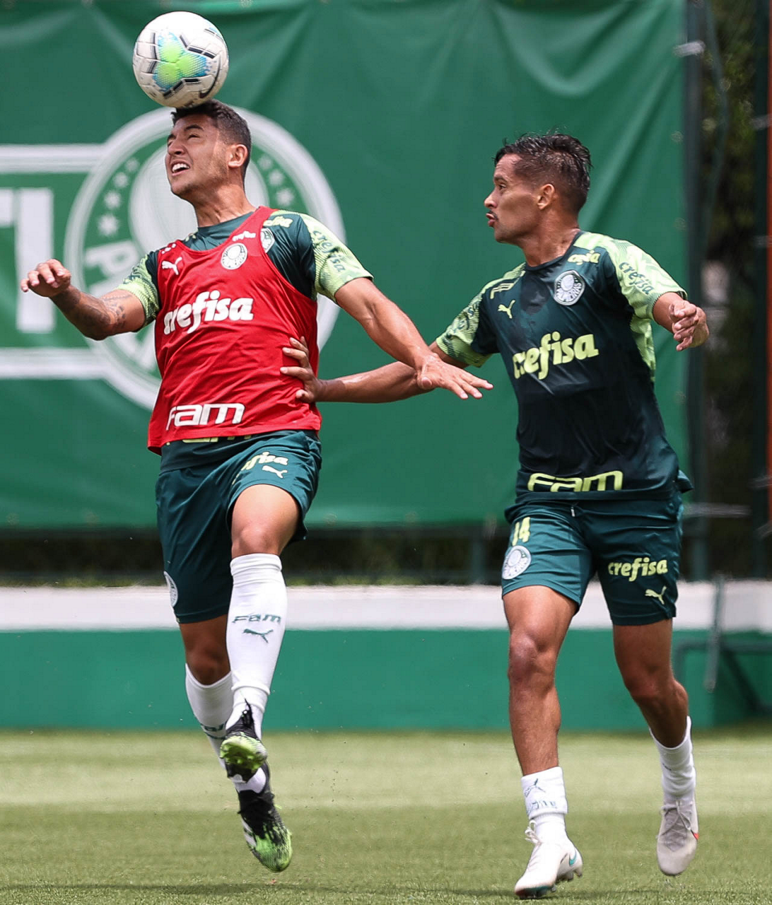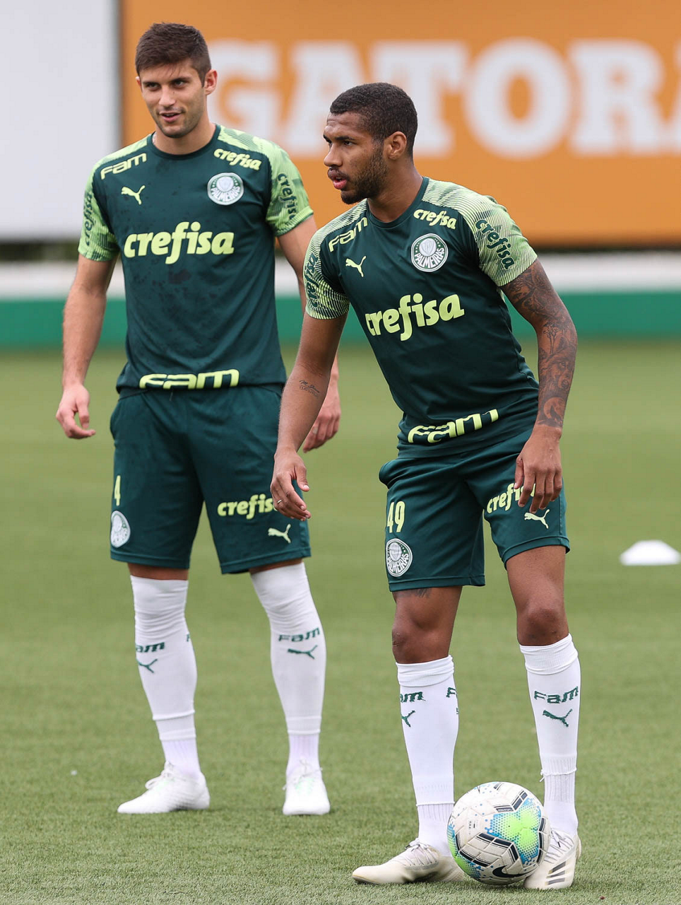 Os jogadores Benjamín Kuscevic e Wesley (D), da SE Palmeiras, durante treinamento, na Academia de Futebol. (Foto: Cesar Greco)
