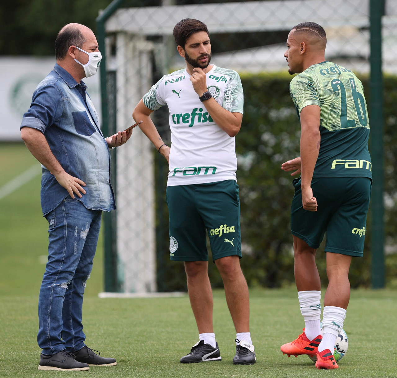 O gerente de futebol Cicero Souza, o auxiliar técnico Carlos Martinho e o jogador Papagaio (E/D), da SE Palmeiras, durante treinamento, na Academia de Futebol. (Foto: Cesar Greco)