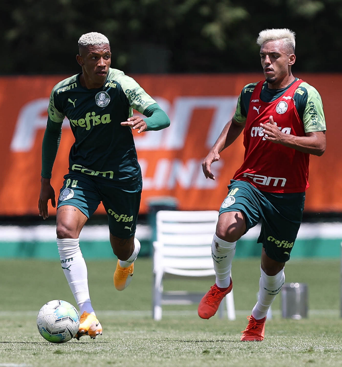 Os jogadores Benjamín Kuscevic e Breno Lopes (D), da SE Palmeiras, durante treinamento, na Academia de Futebol. (Foto: Cesar Greco)