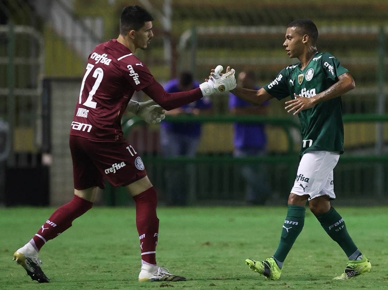 O goleiro Vinicius e o jogador Garcia (D), da SE Palmeiras, em jogo contra a equipe do SC São Bento, durante partida válida pela terceira rodada, do Campeonato Paulista, Série A1, no Estádio Raulino de Oliveira. (Foto: Cesar Greco)