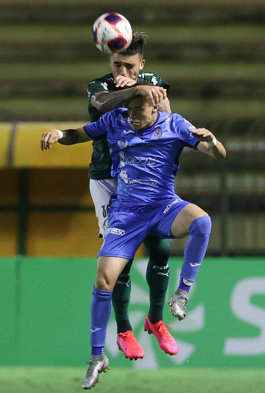 O jogador Gustavo Gómez, da SE Palmeiras, disputa bola com o jogador Daniel Costa, do SC São Bento, durante partida válida pela terceira rodada, do Campeonato Paulista, Série A1, no Estádio Raulino de Oliveira. (Foto: Cesar Greco)