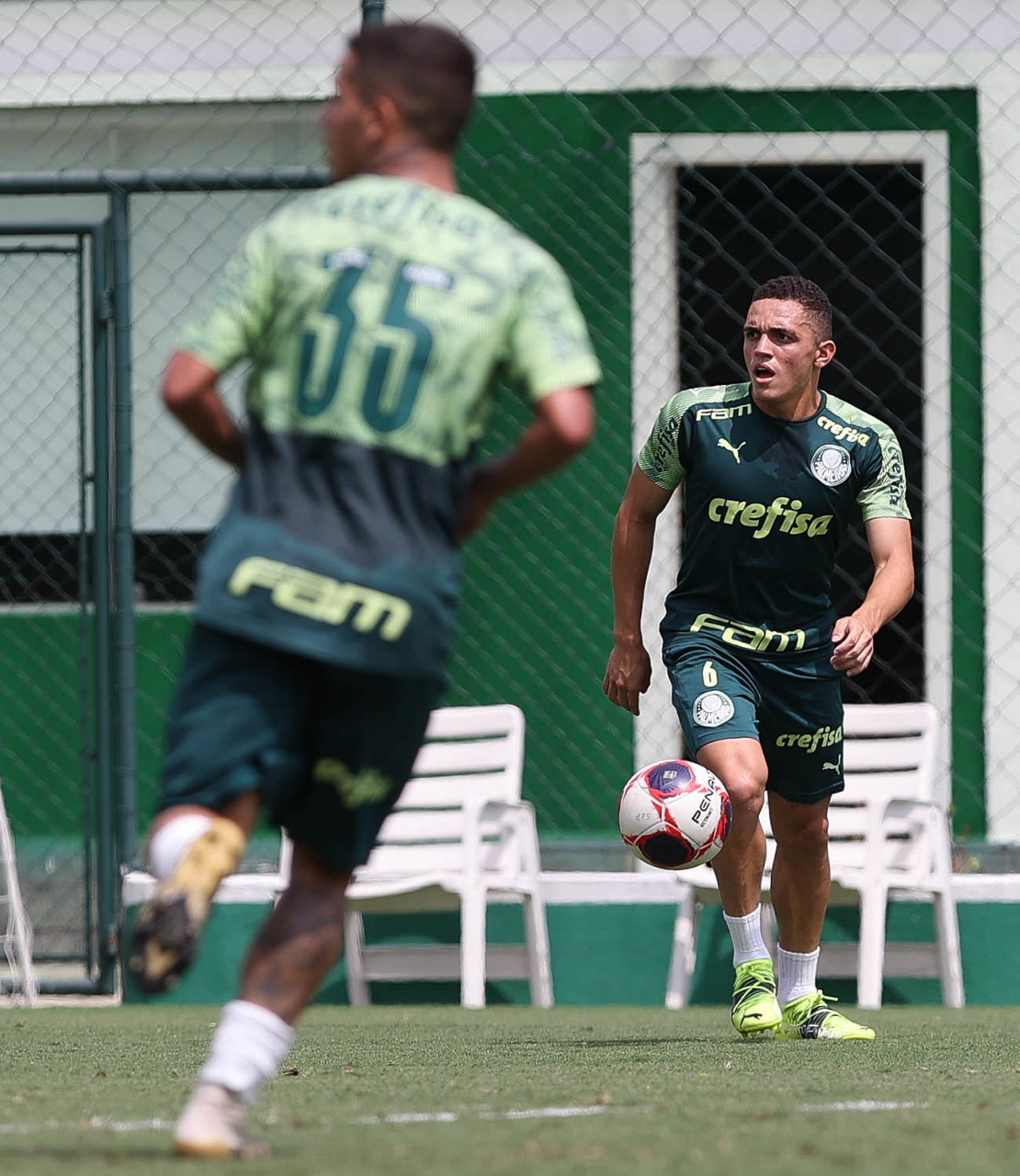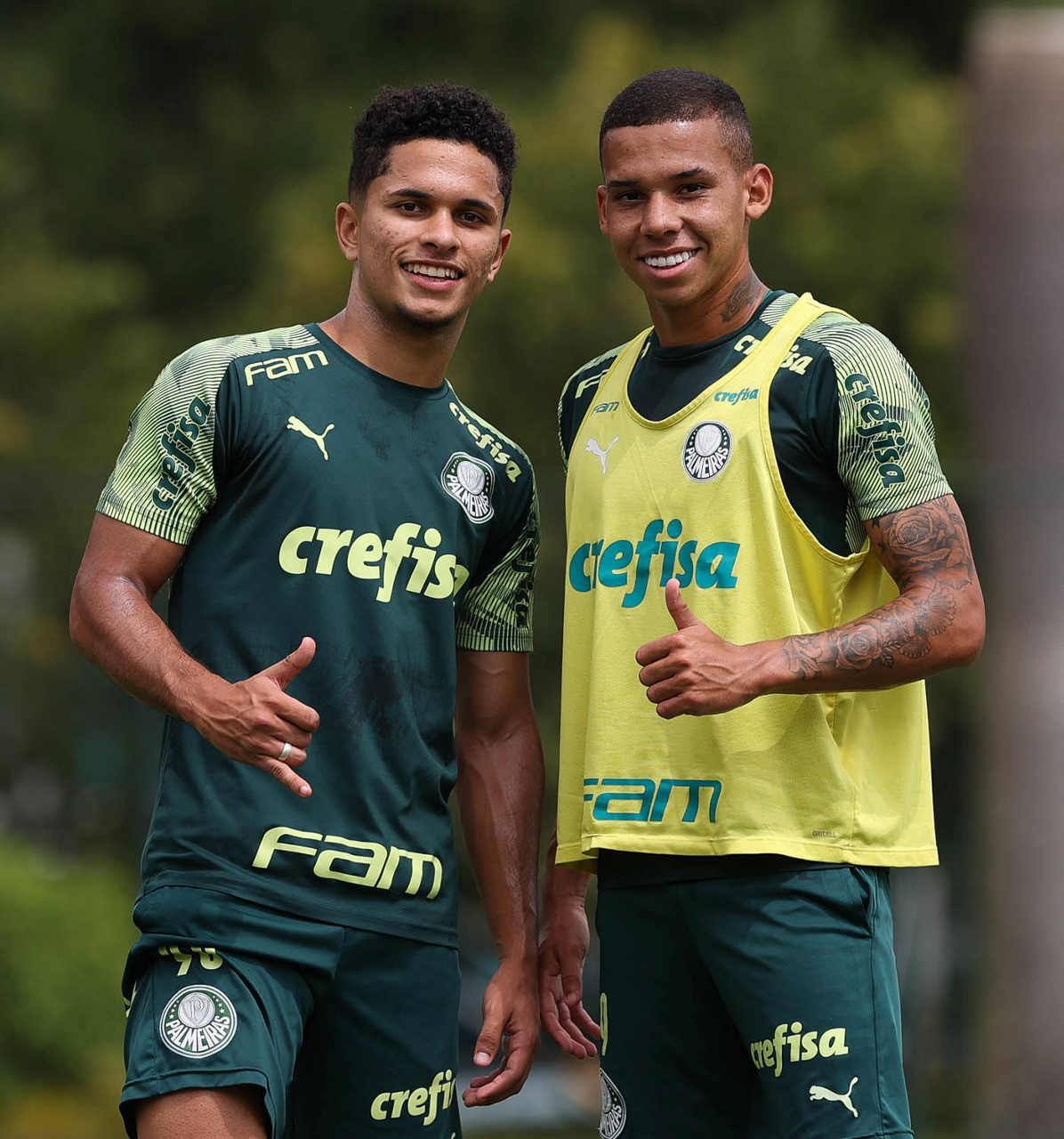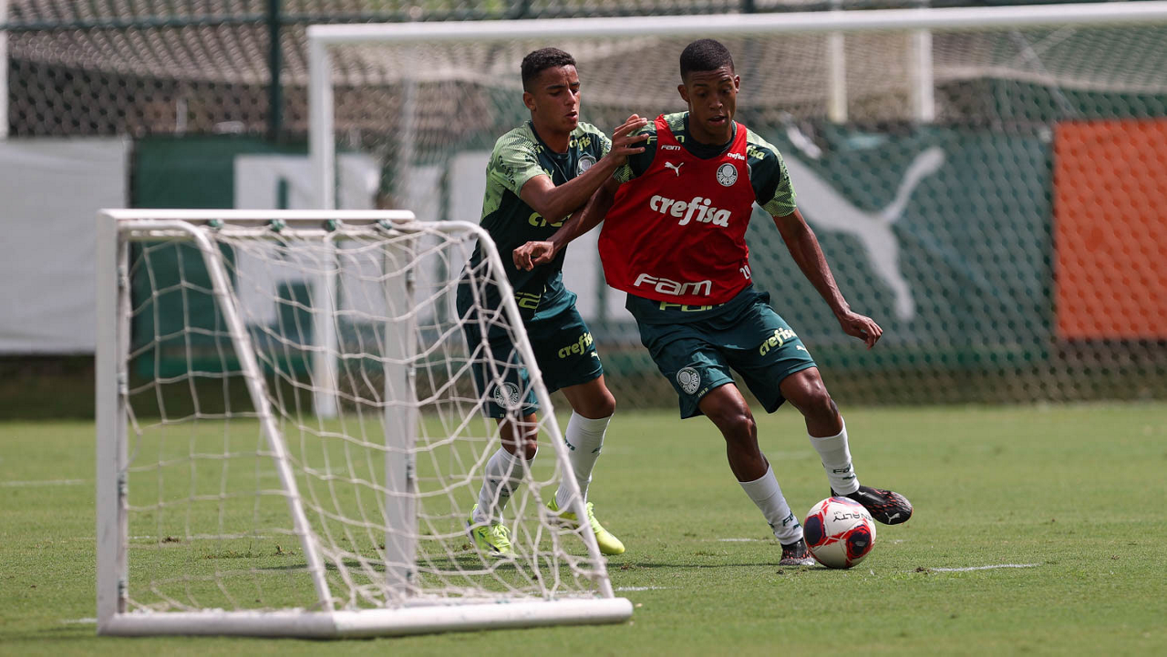 Os jogadores Newton e Vitinho (D), da SE Palmeiras, durante treinamento, na Academia de Futebol. (Foto: Cesar Greco)