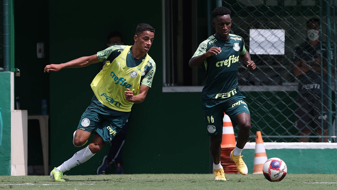 Os jogadores Gabriel Silva, Rafael Elias e Victor Luis (E/D), da SE Palmeiras, durante treinamento, na Academia de Futebol. (Foto: Cesar Greco)