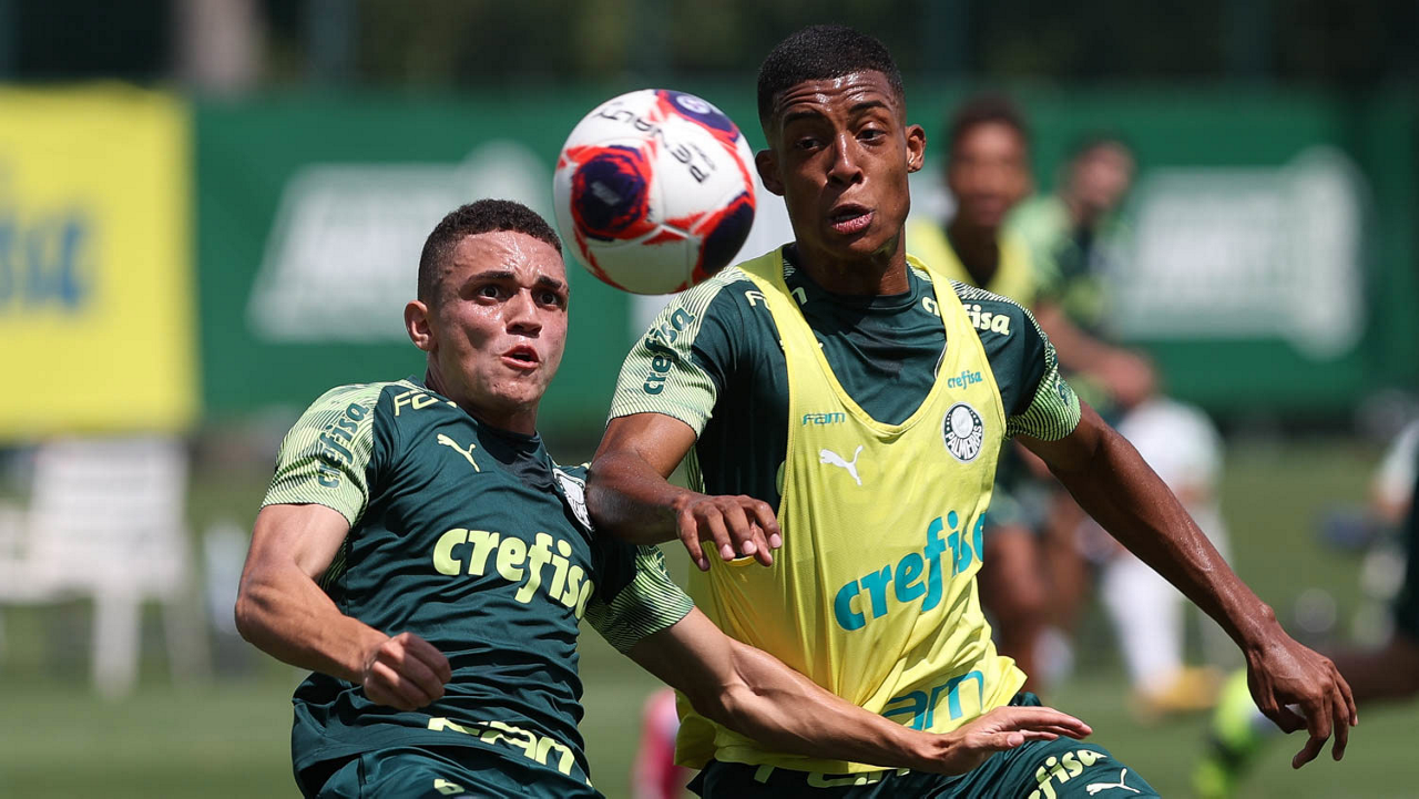Os jogadores Henri e Luan Campos (D), da SE Palmeiras, durante treinamento, na Academia de Futebol. (Foto: Cesar Greco)