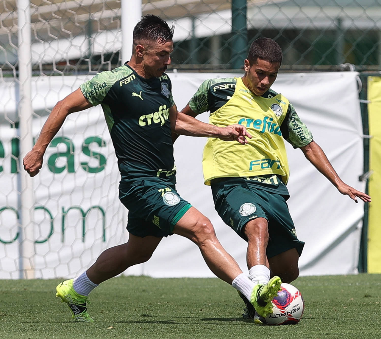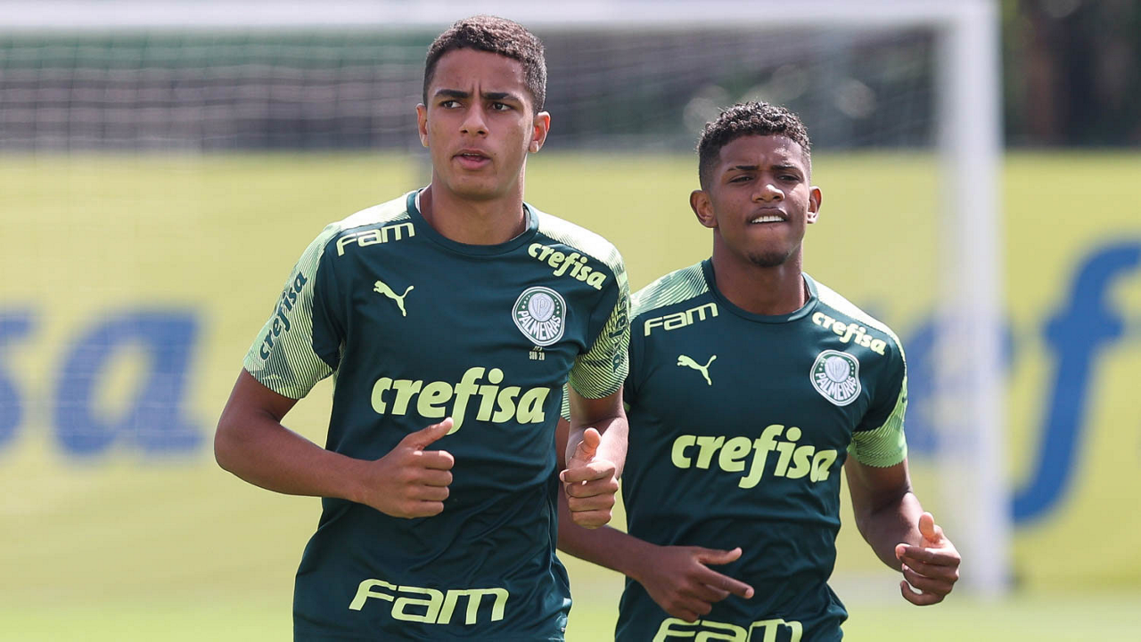 O jogador Victor Luis e o goleiro Vinicius (D), da SE Palmeiras, durante treinamento, na Academia de Futebol. (Foto: Cesar Greco)