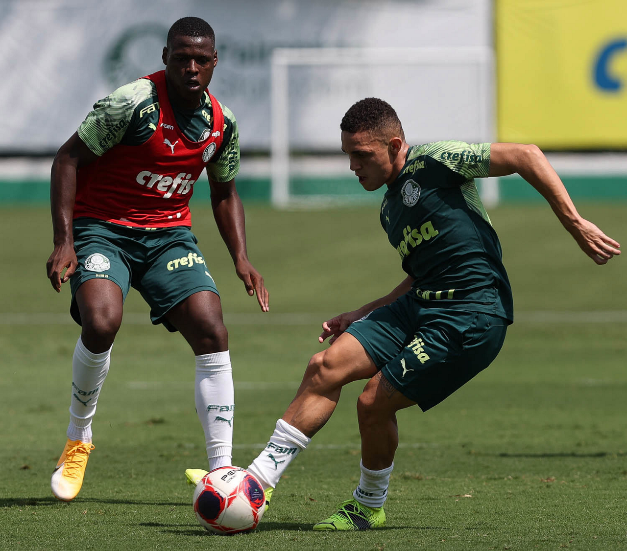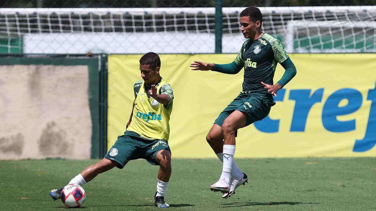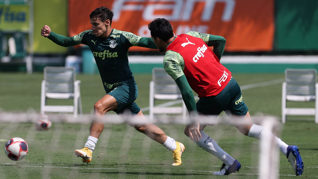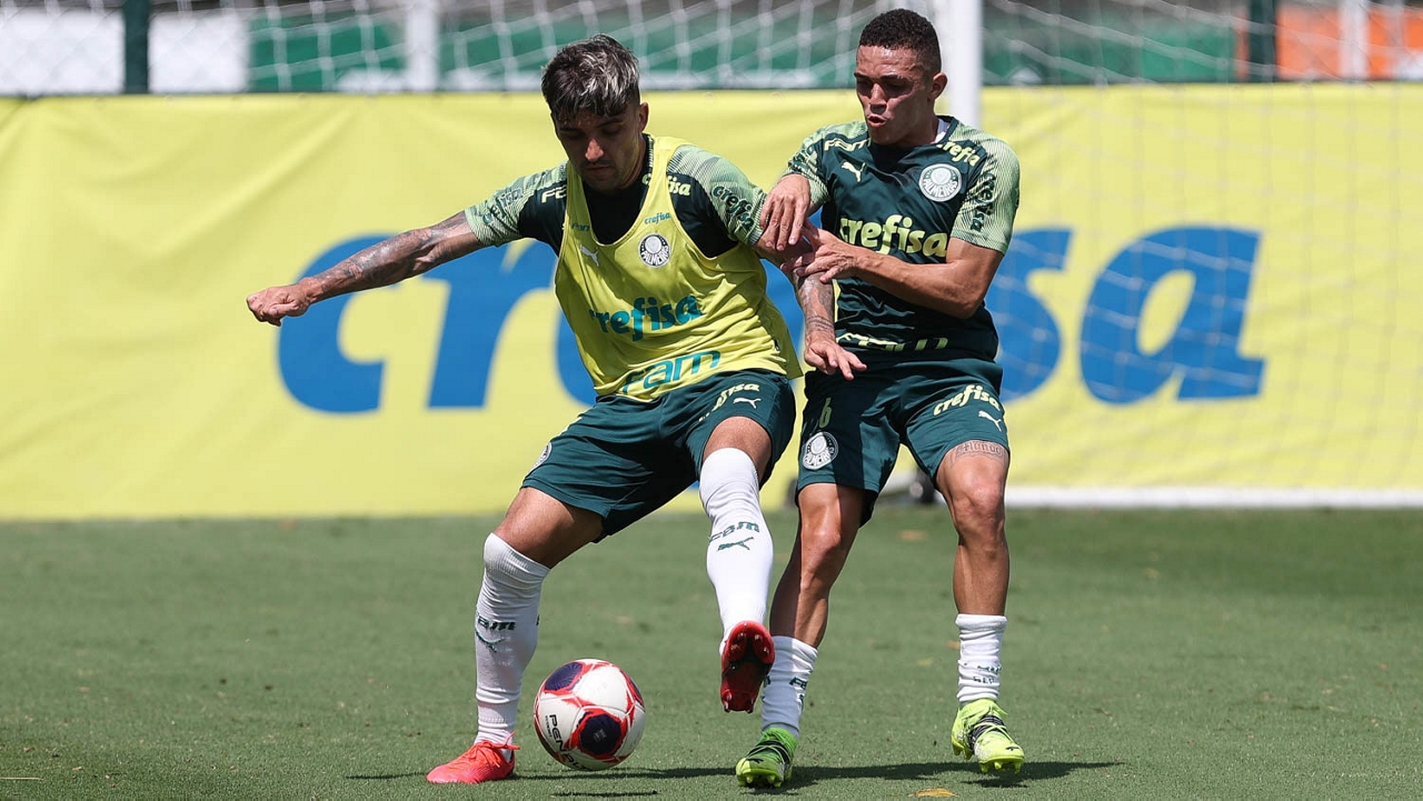 Os jogadores Raphael Veiga e Gustavo Gómez (D), da SE Palmeiras, durante treinamento, na Academia de Futebol. (Foto: Cesar Greco)