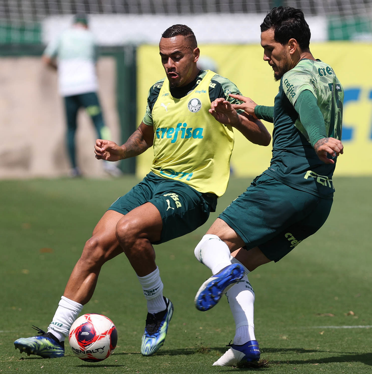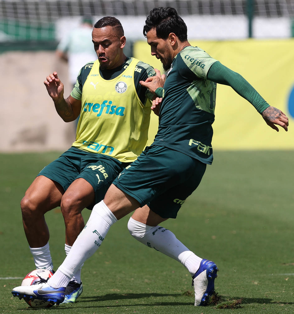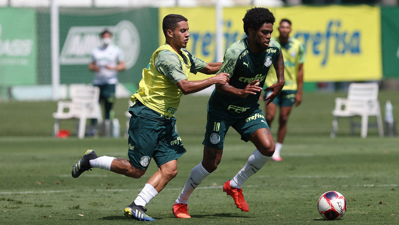 Os jogadores Raphael Veiga e Gustavo Gómez (D), da SE Palmeiras, durante treinamento, na Academia de Futebol. (Foto: Cesar Greco)