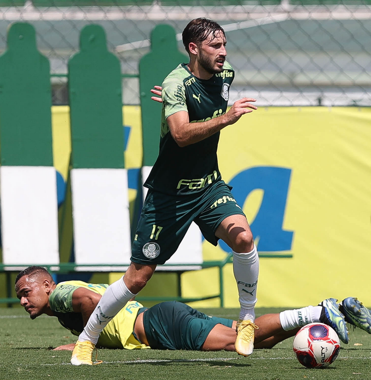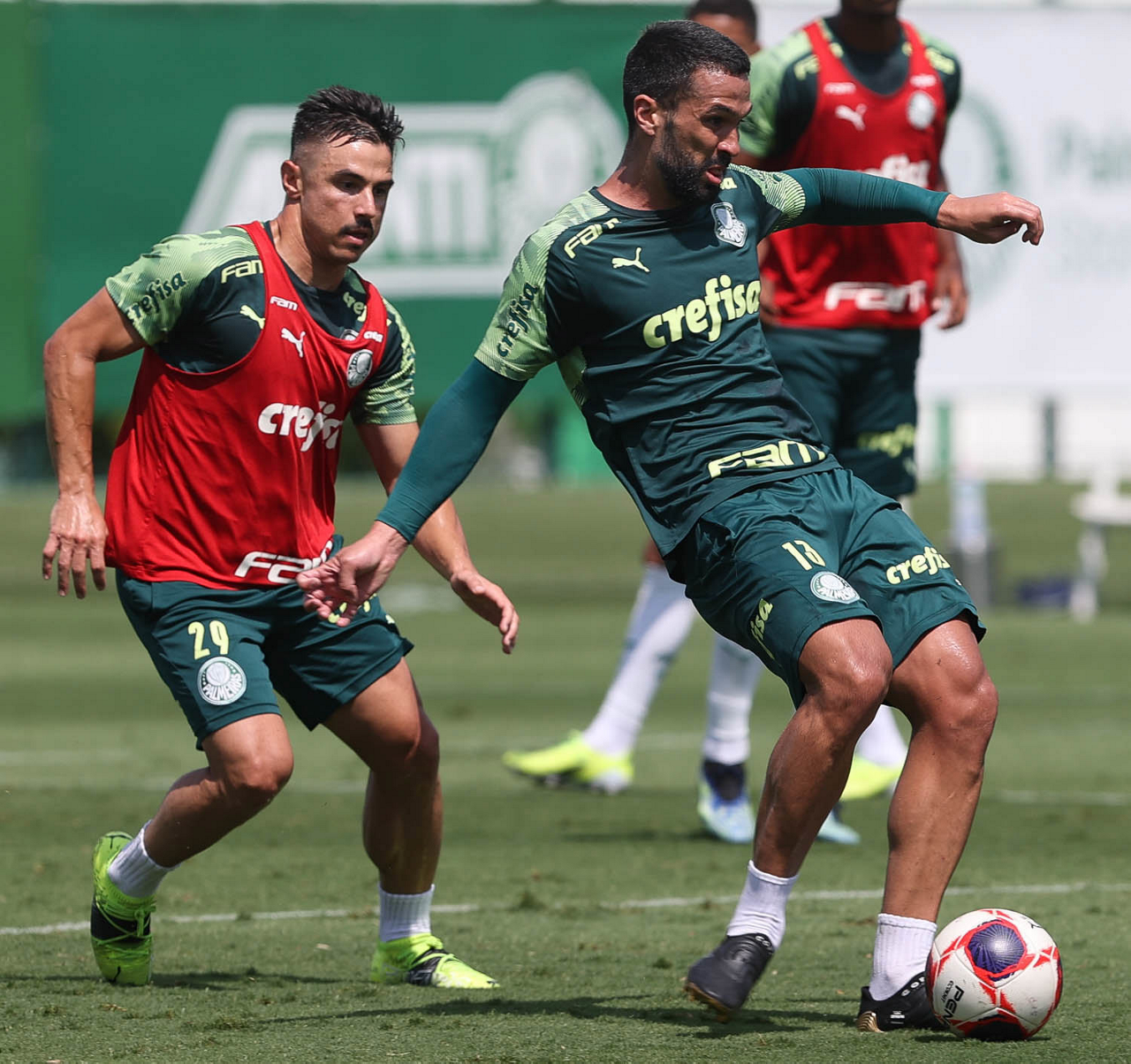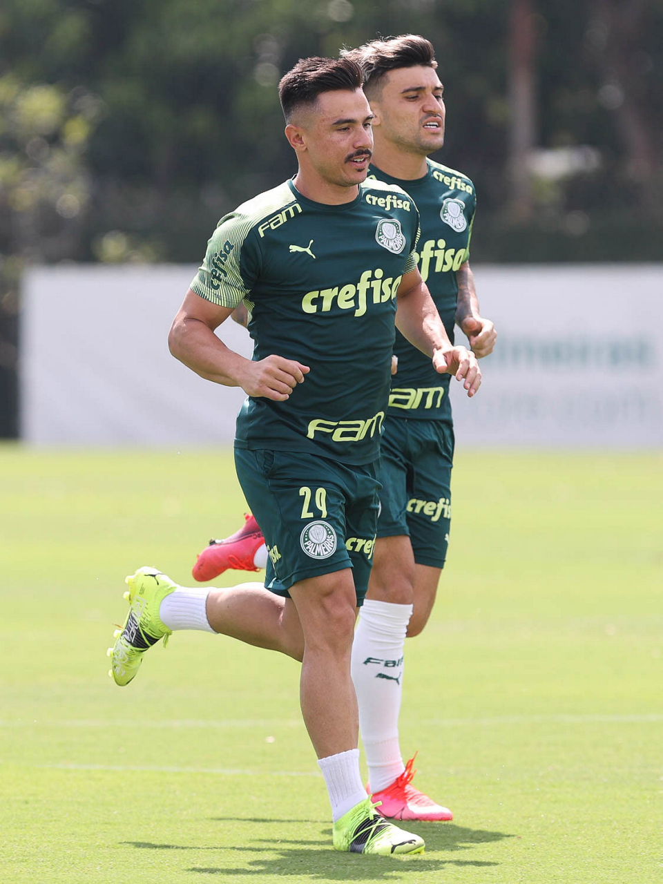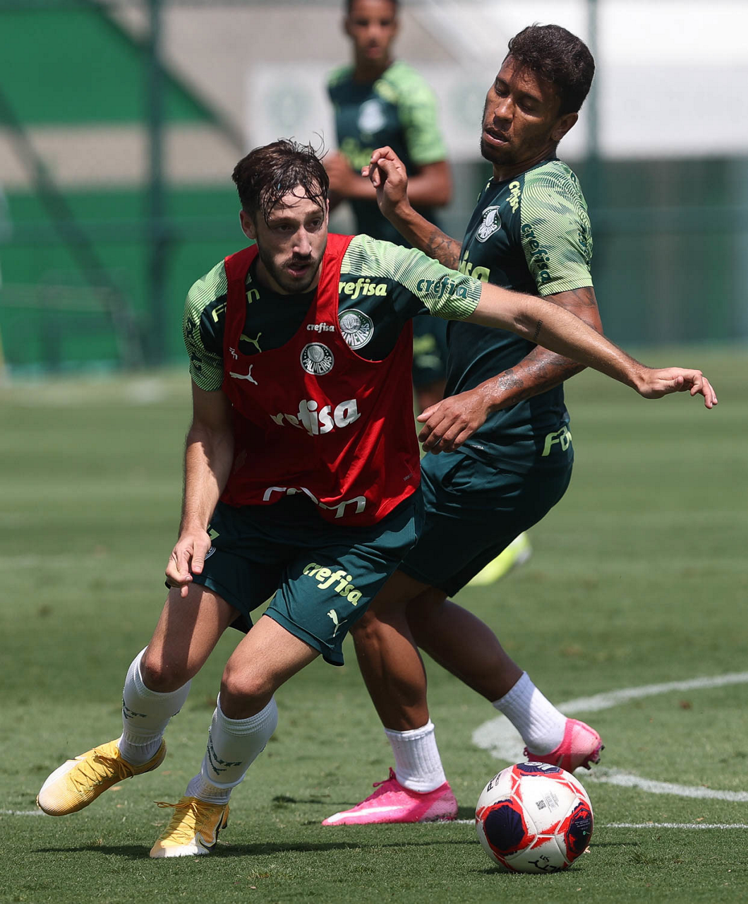 Os jogadores Rafael Elias e Matías Viña (D), da SE Palmeiras, durante treinamento, na Academia de Futebol. (Foto: Cesar Greco)