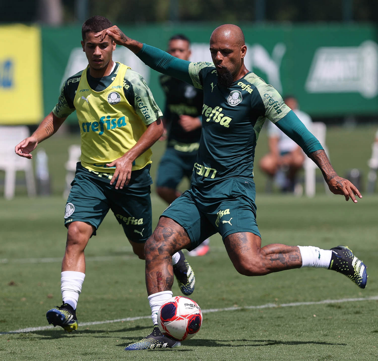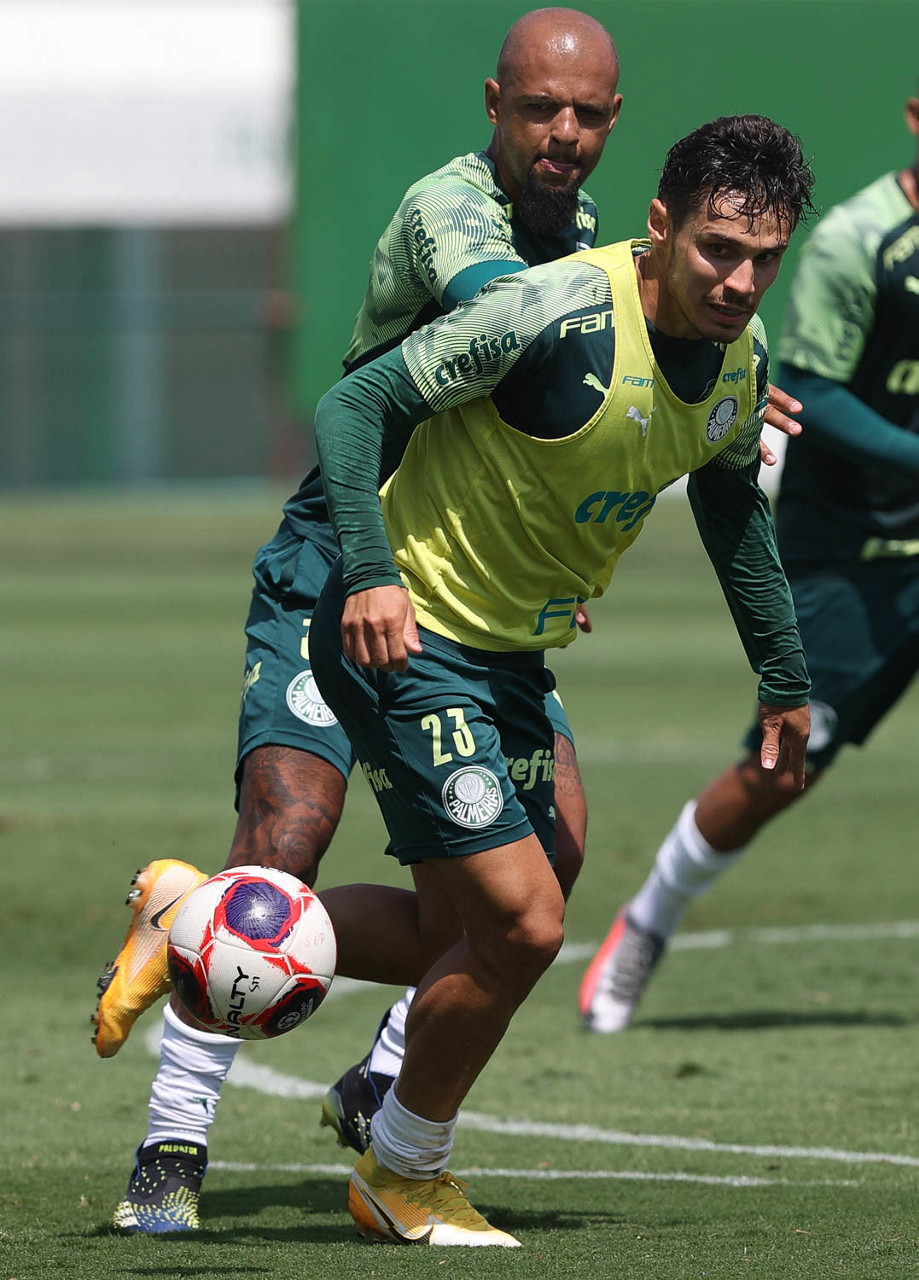 Os jogadores Felipe Melo e Raphael Veiga (D), da SE Palmeiras, durante treinamento, na Academia de Futebol. (Foto: Cesar Greco)