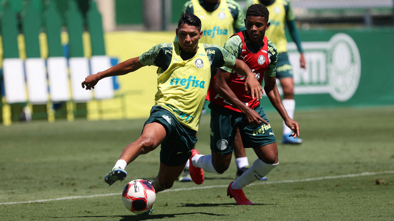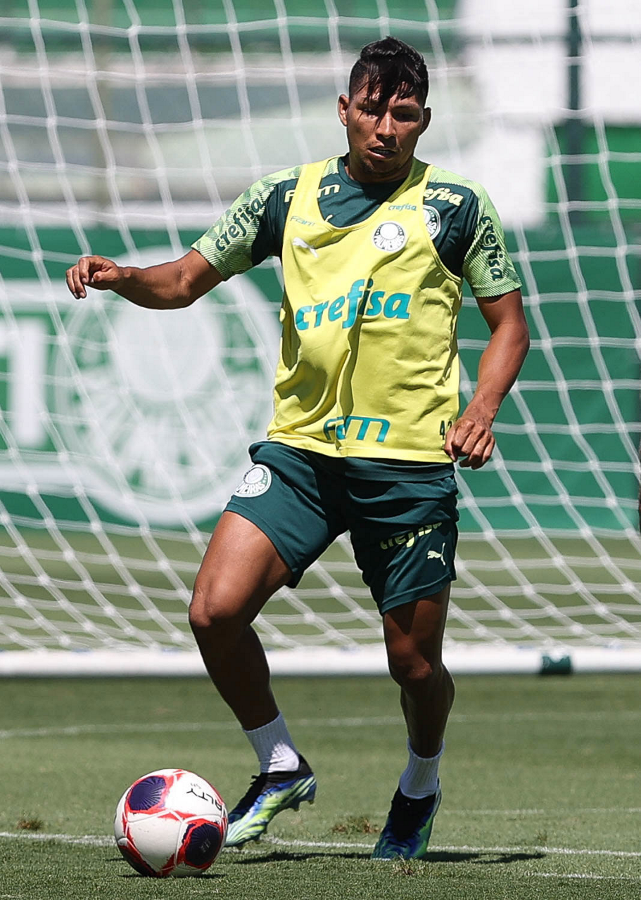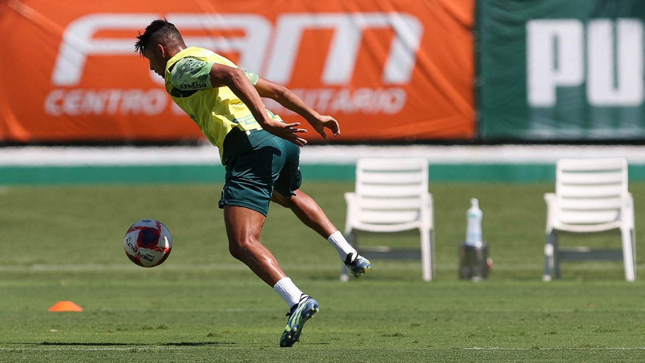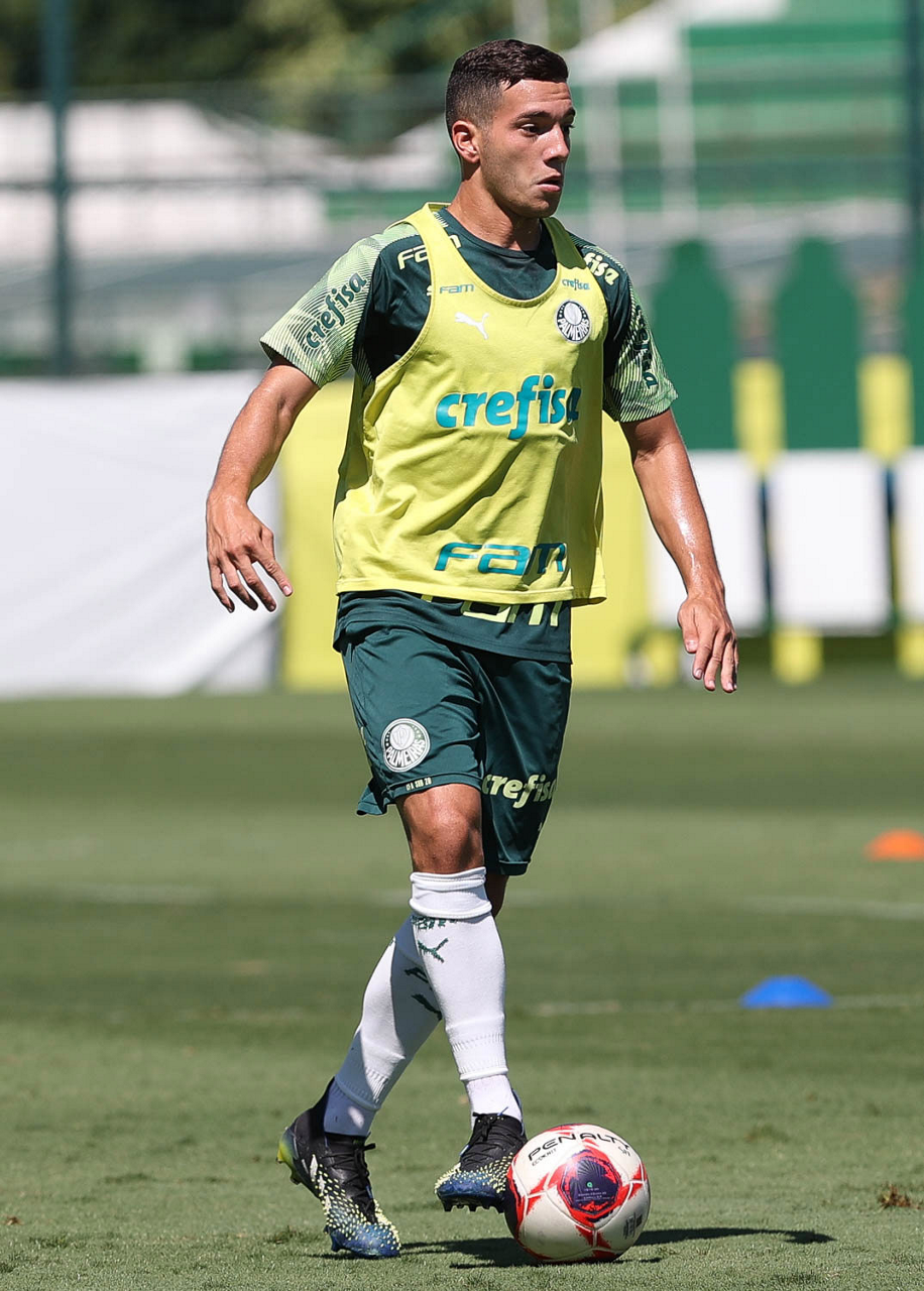 O jogador Raphael Veiga, da SE Palmeiras, durante treinamento, na Academia de Futebol. (Foto: Cesar Greco)