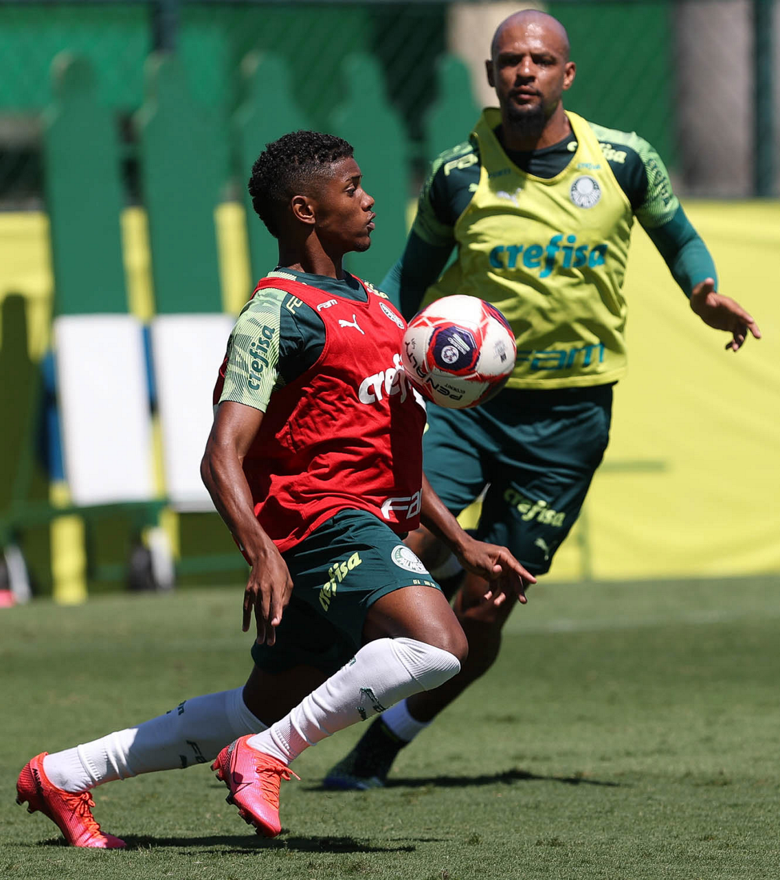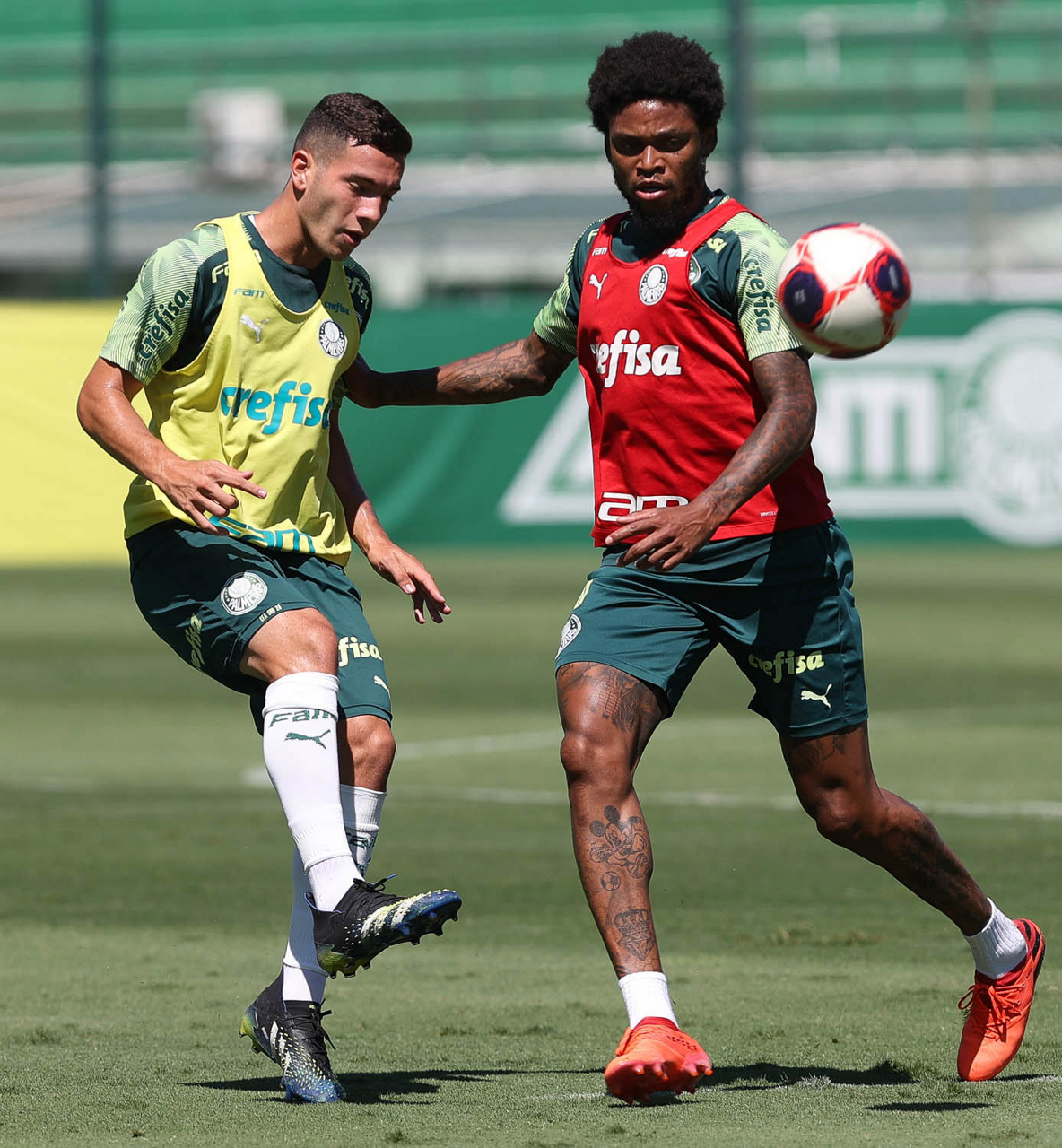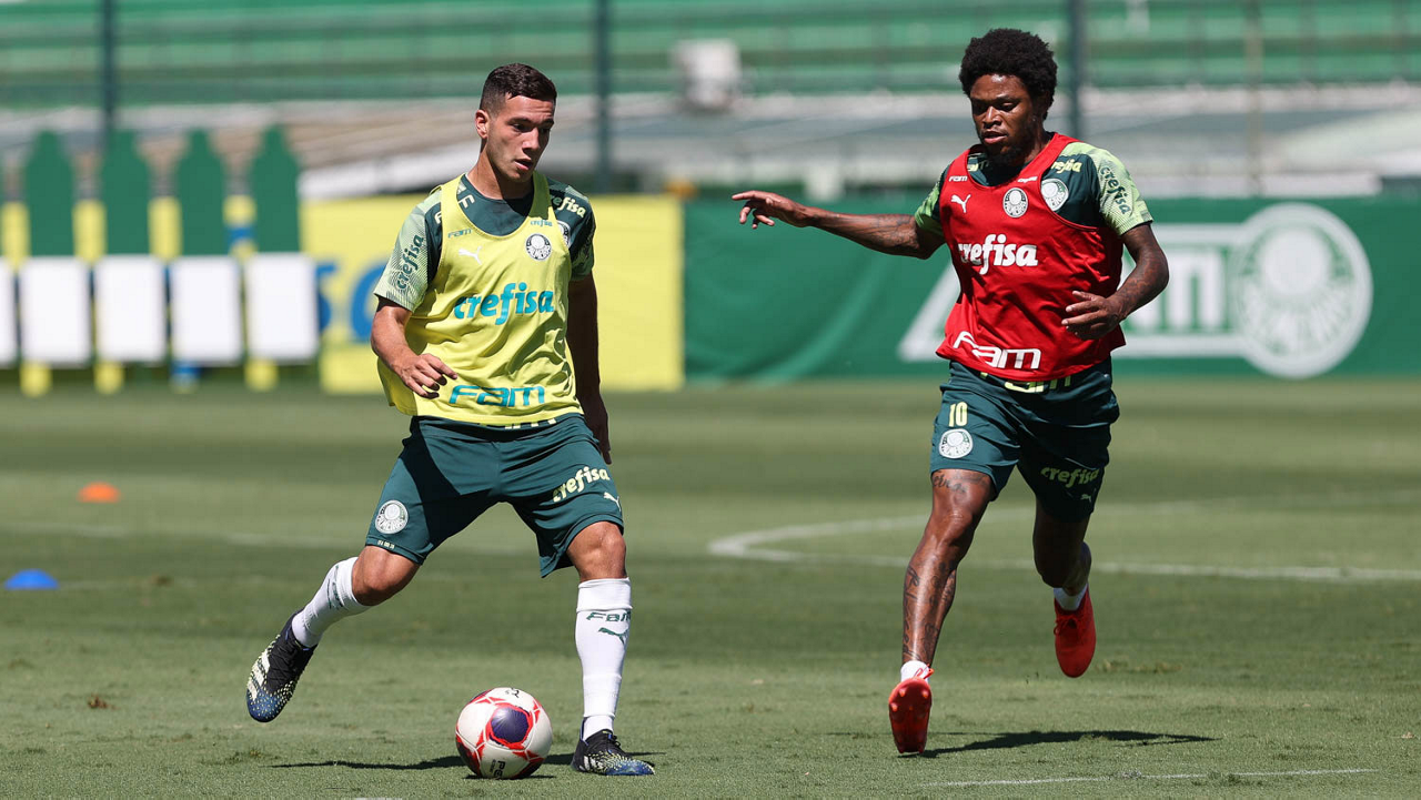Os jogadores Victor Luis e Matías Viña (D), da SE Palmeiras, durante treinamento, na Academia de Futebol. (Foto: Cesar Greco)